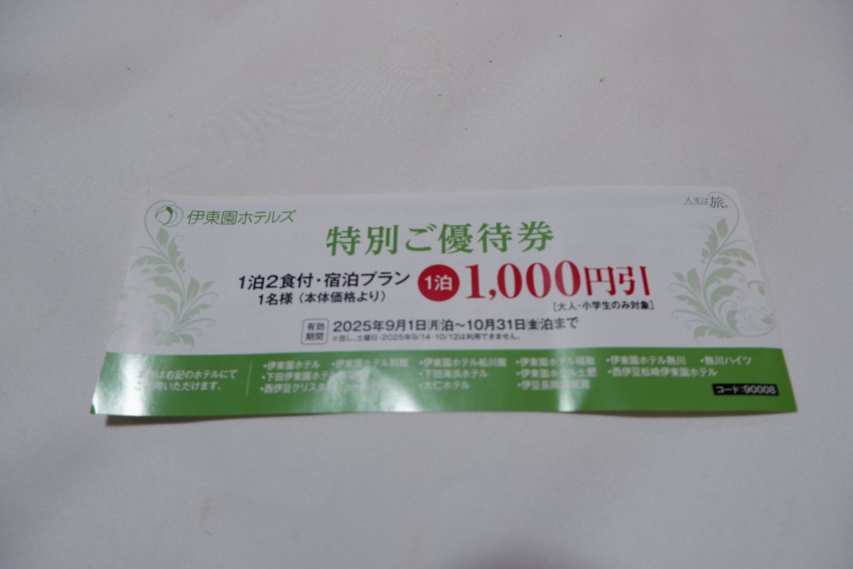 伊東園ホテルズ 1泊2食付き宿泊プランより1名様1000円引きになる優待券です。