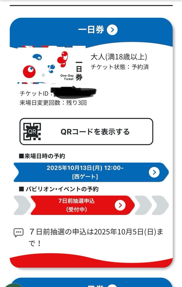 関西万博 大人一日券 10/13 最終日 西ゲート 12 予約です。行けなくなったので、出品しました。