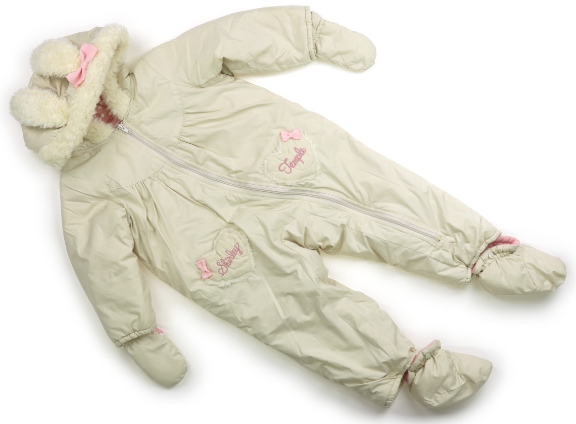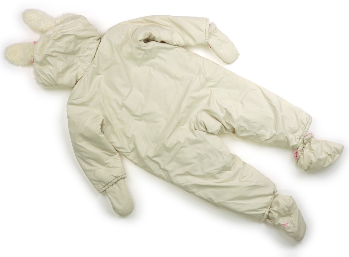 実際のサイズ表記はF。ポリエステル。裏地は綿。中綿の暖かいアイテムです。ミトンとブーティーは取り外し可能。全体に使用感はありますがまだお使いいただけそうです。