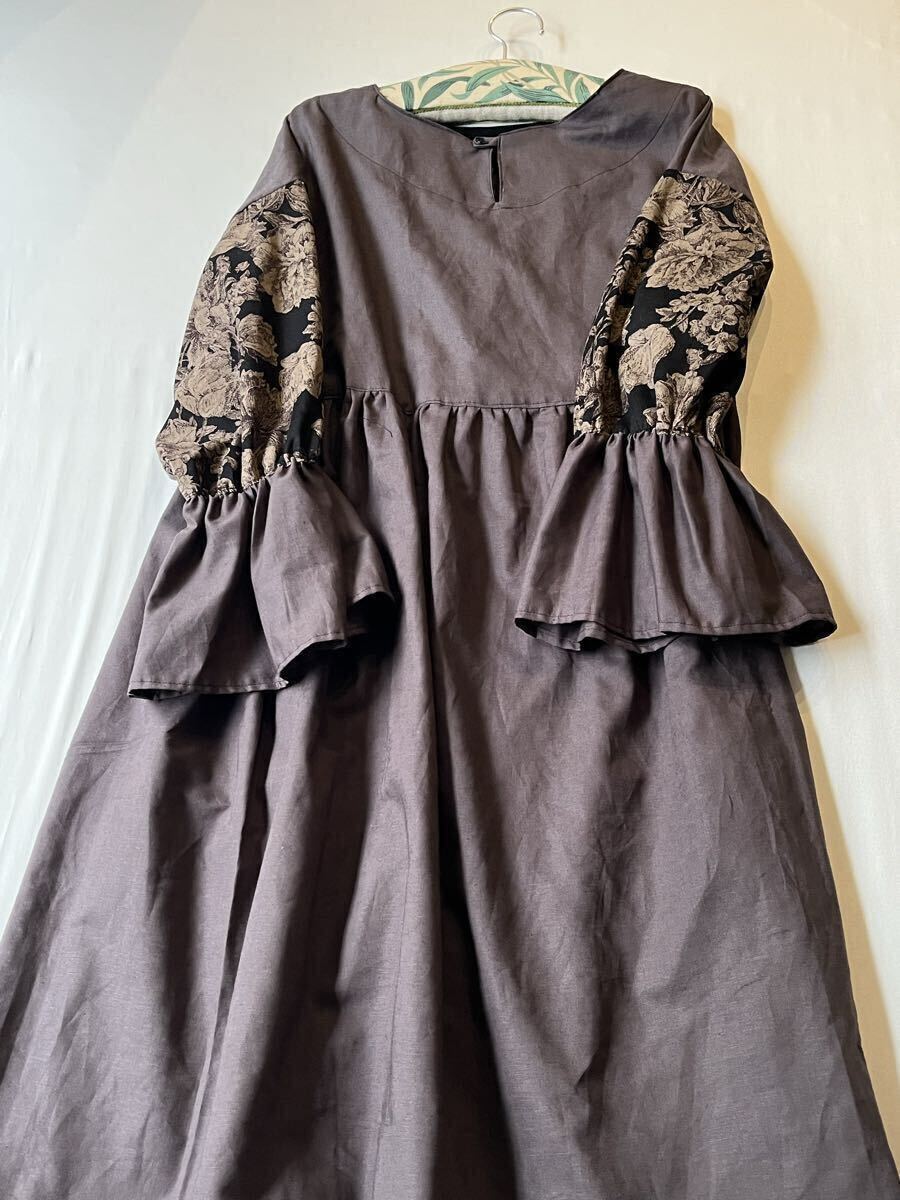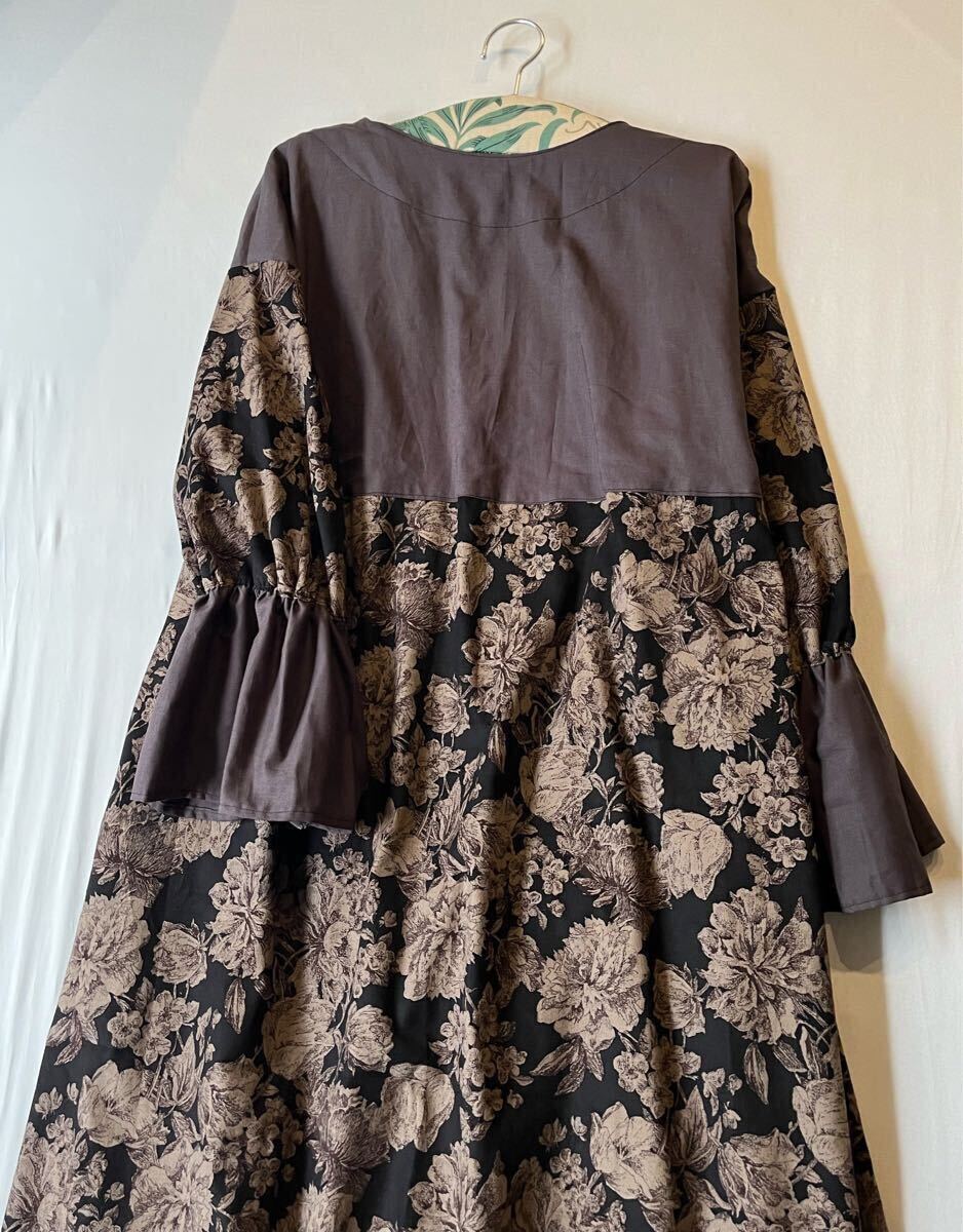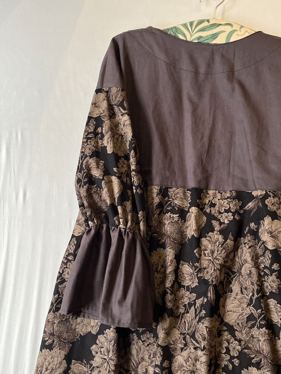 アンティークなローズ柄のコーディロイのブラックのお色の生地とリネンのブラウンのお色の生地で秋物のAラインのワンピースを作ってみました。