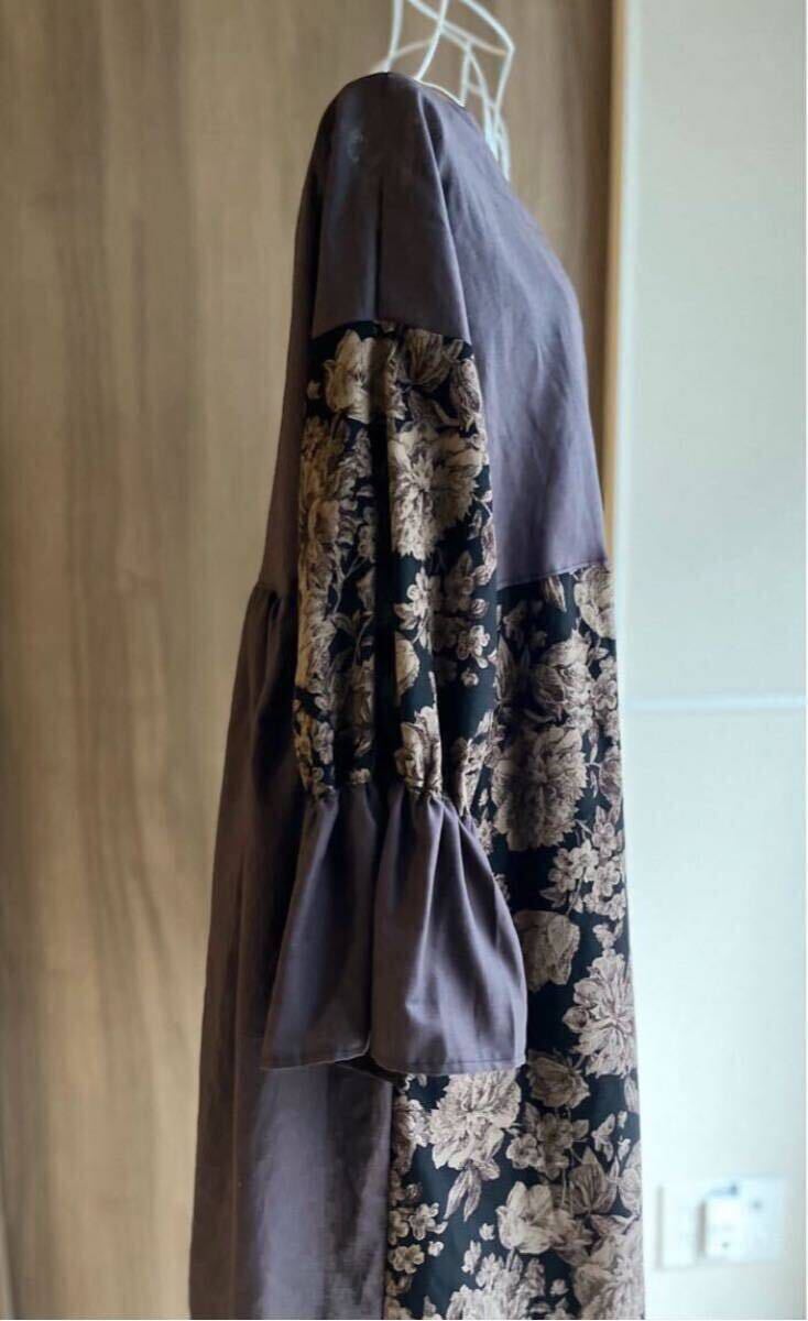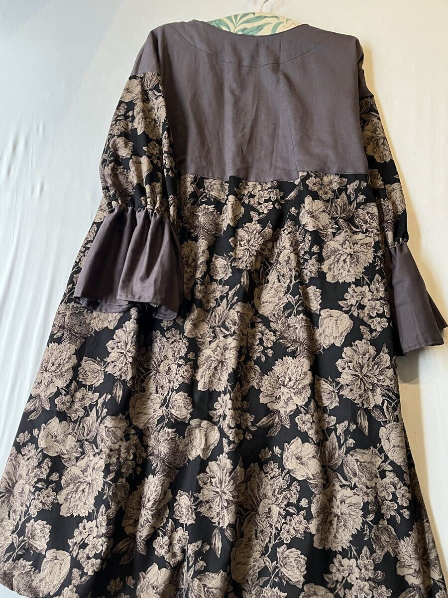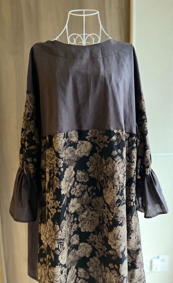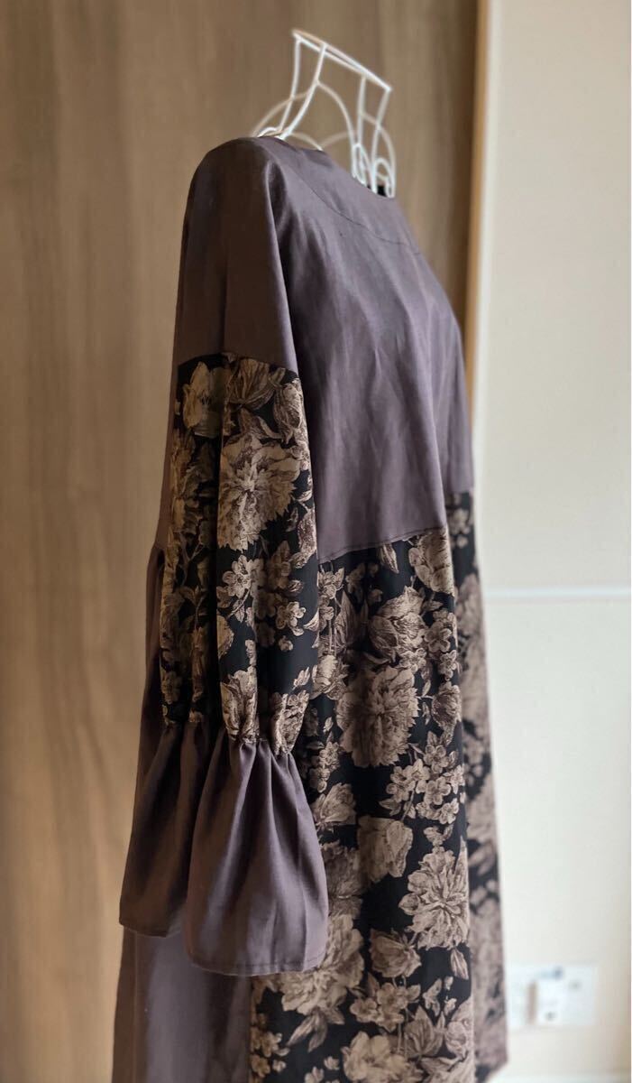 アンティークなローズ柄のコーディロイのブラックのお色の生地とリネンのブラウンのお色の生地で秋物のAラインのワンピースを作ってみました。