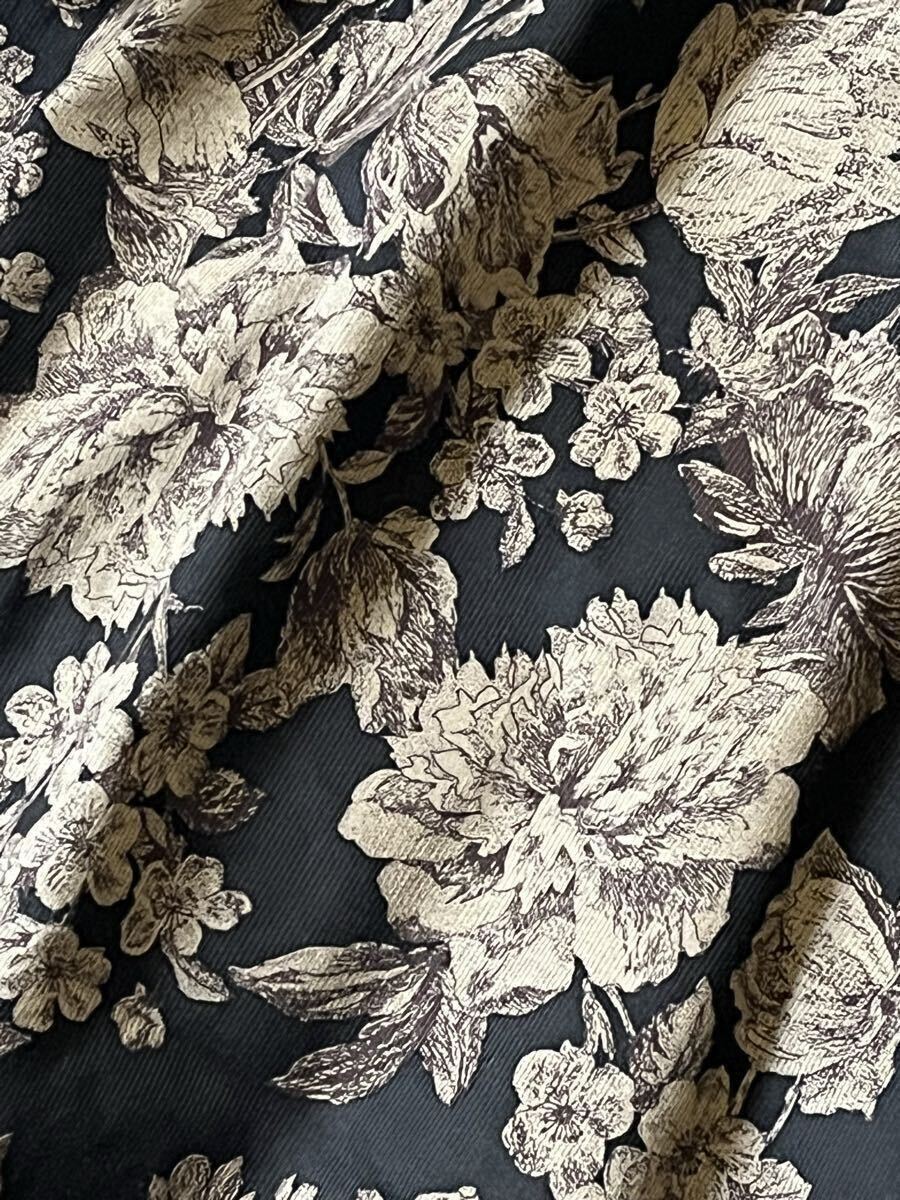 ブラックの生地に薔薇の柄がブラウンで描かれています。