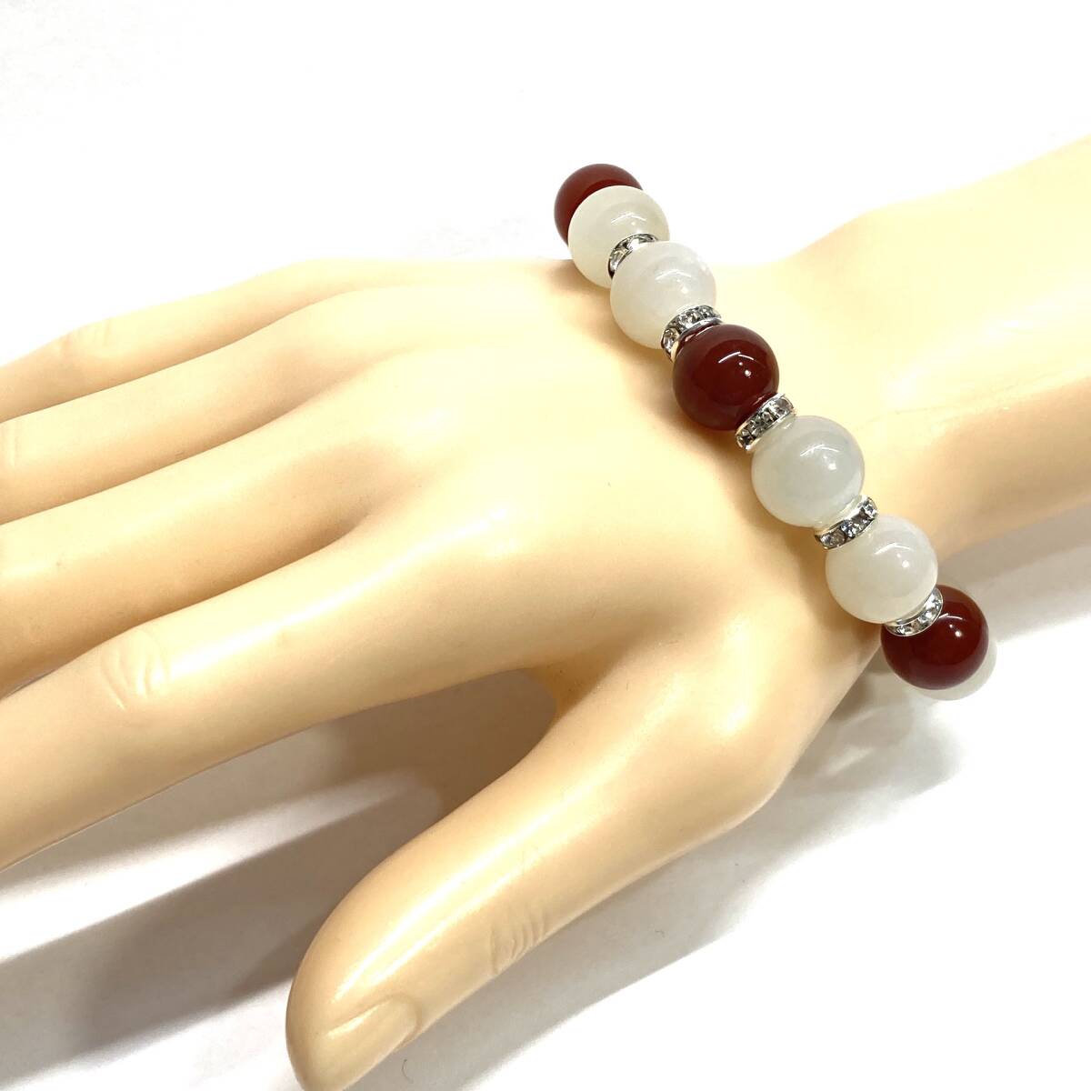 こちらは、ムーンストーンと赤瑪瑙を組み合わせたパワーストーンブレスレットです。間にはロンデルを挟み高級感あるデザインに仕上げております。程よくインパクトがある12mm玉を使用して内周約18cmです。(サイズ変更の場合は取引ナビにてご連絡をお願いします。) 数に限りがございますので気になる方はお早めにどうぞ。