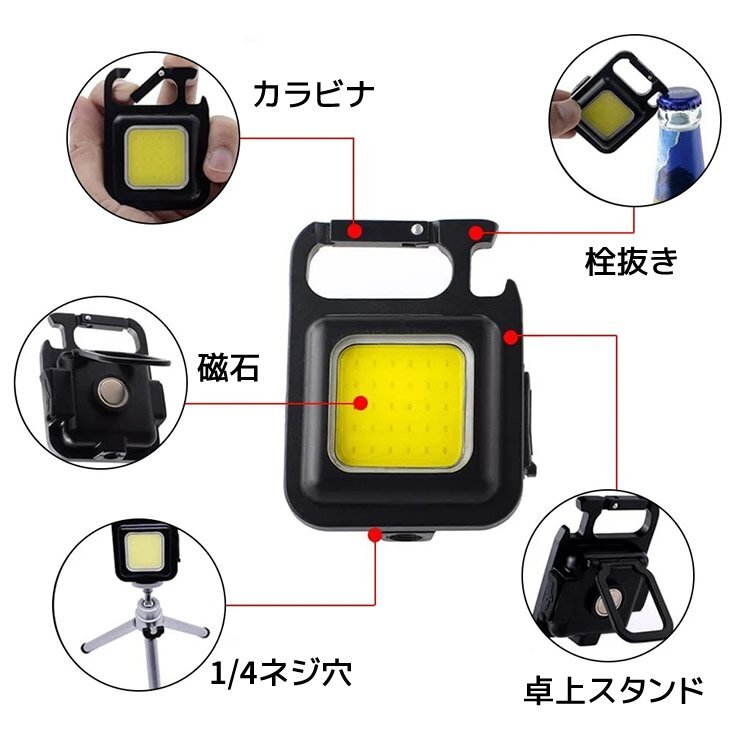 ◆キーリング式COBライト Type-C充電式 4つの点灯モード 磁石付き 懐中電灯 作業灯 高輝度LED投光器 アウトドア キャンプ ランニング 停電 カラビナ 栓抜き 防災に KRCOB500