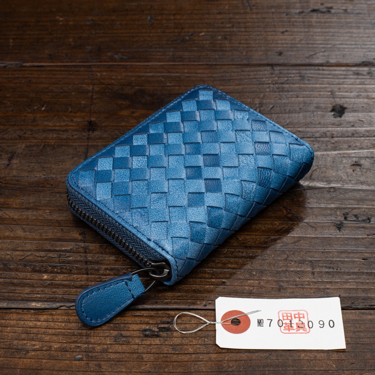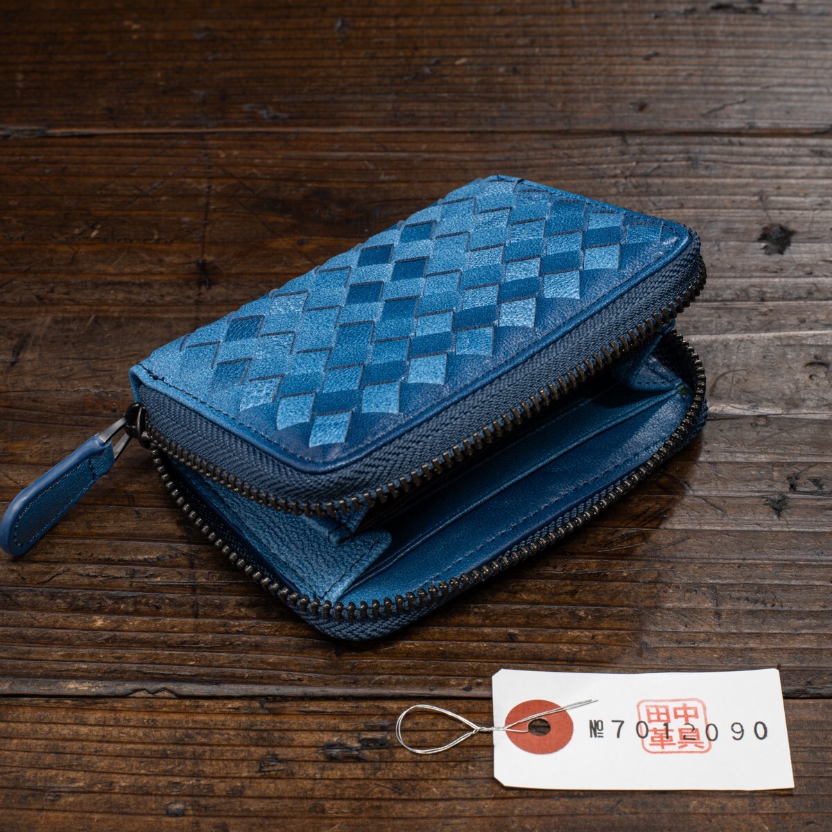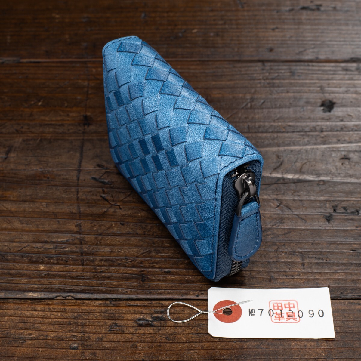 シープレザー【羊革】編み込み イントレチャート メンズ 本革 財布 二つ折り ラウンドファスナー 新品 未使用 送料無料 1円 青 田中革具