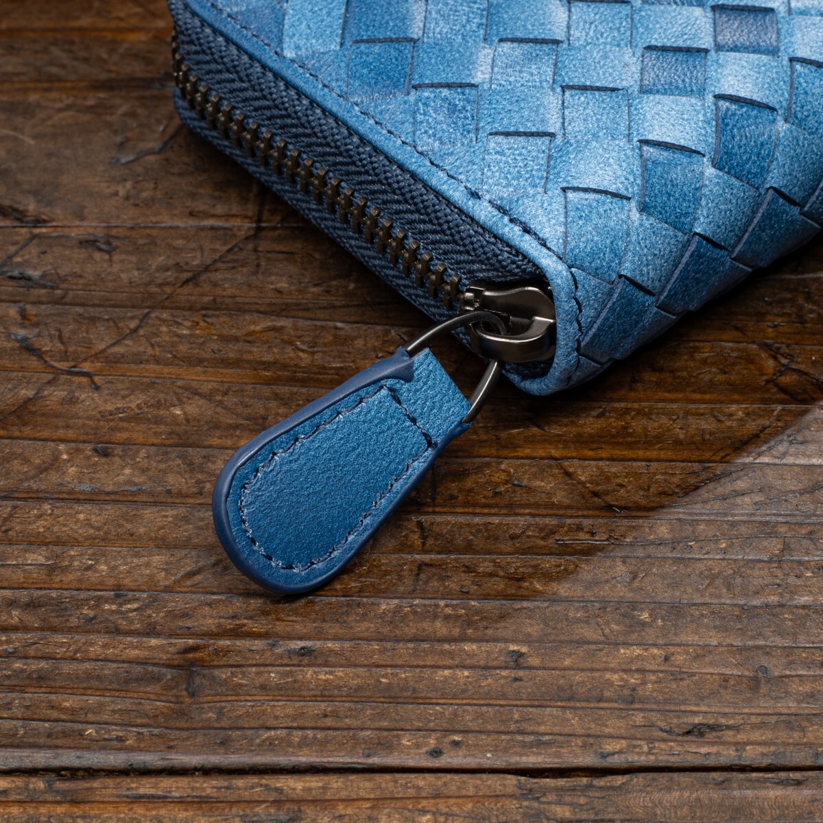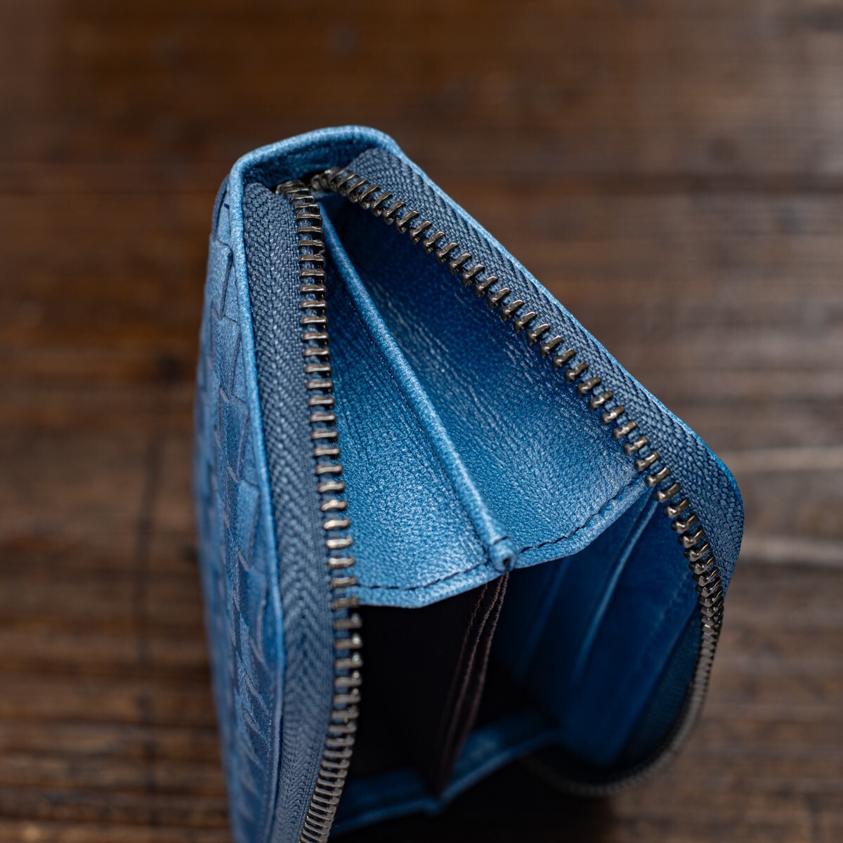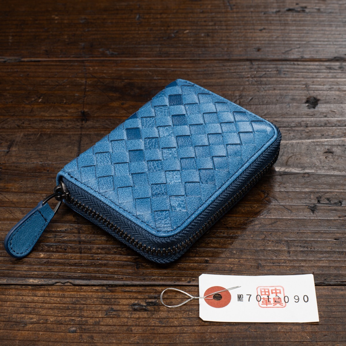 シープレザー【羊革】編み込み イントレチャート メンズ 本革 財布 二つ折り ラウンドファスナー 新品 未使用 送料無料 1円 青 田中革具
