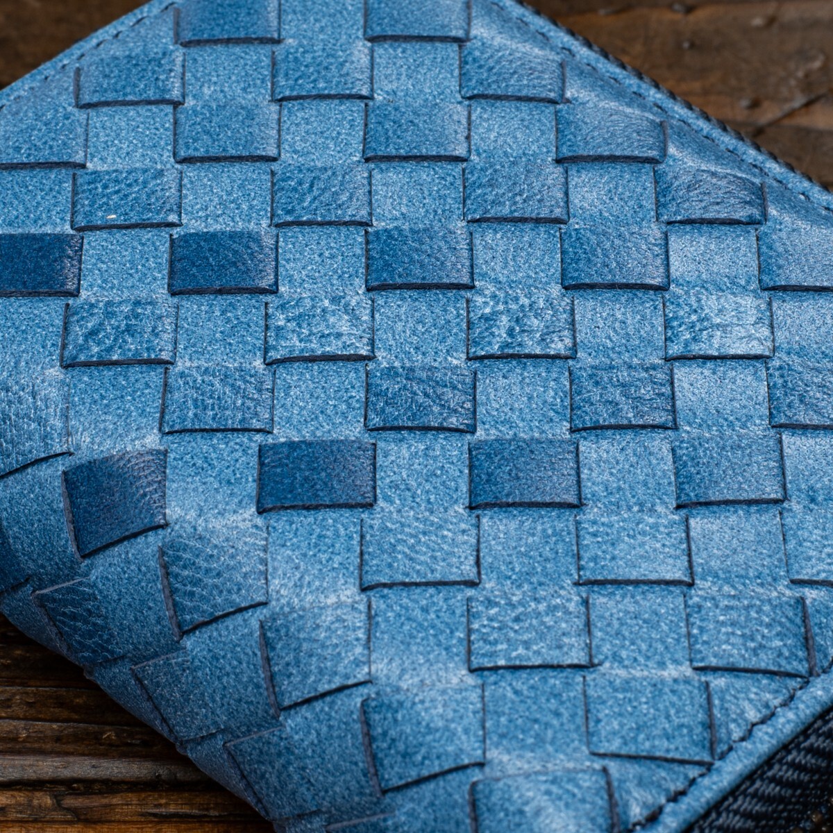 表面はイントレチャートと呼ばれる編み込み仕上げで、ブルーの革が光の加減で濃淡を見せます。鮮やかさのある青色は、カジュアルな服装に映えるファッショナブルな雰囲気を持ちながら、編み込みの艶感が落ち着いた大人らしさも添えています。小ぶりでも高級感があり、ちょっとした外出にも気軽に持ち出せます。