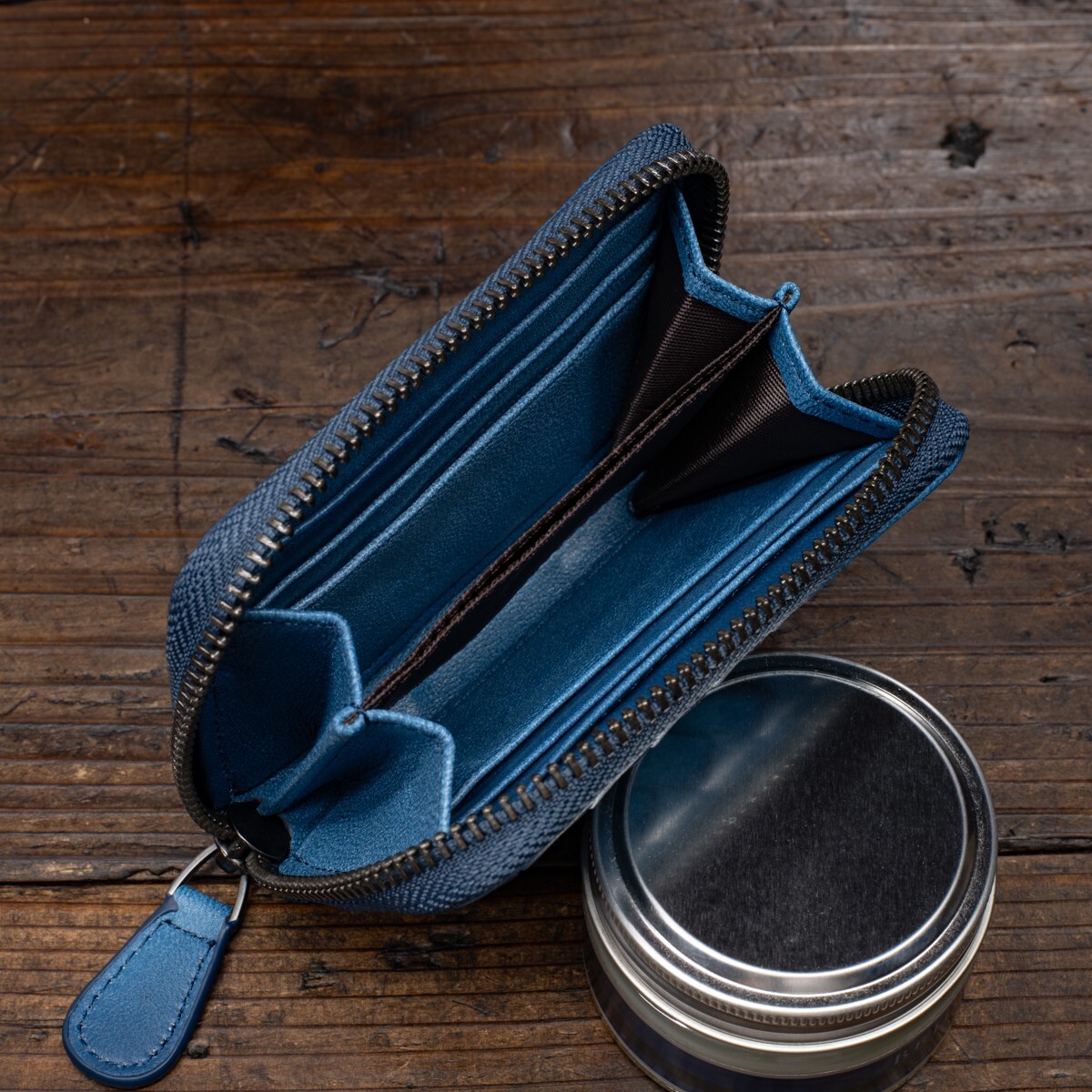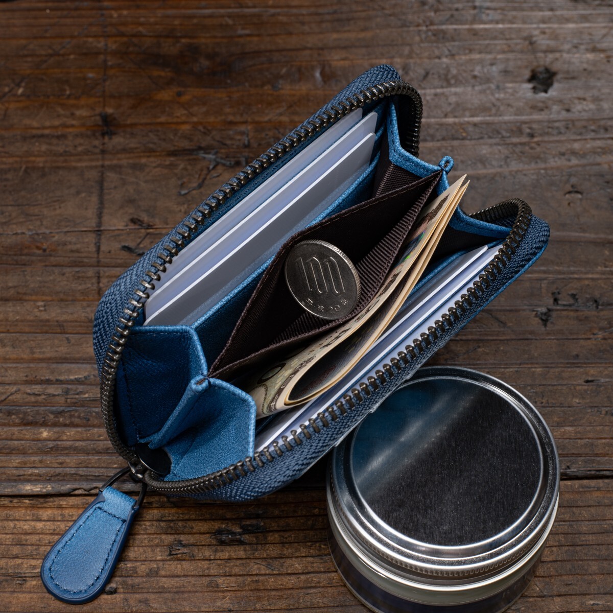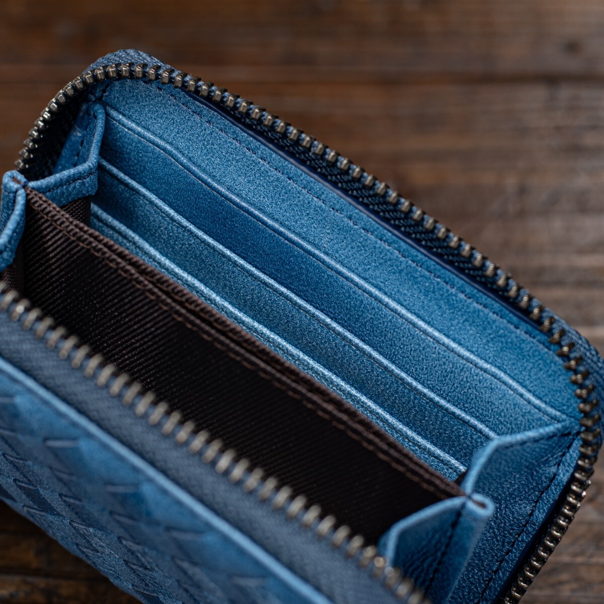 鮮やかなブルーの編み込みがアクセントになり、カジュアルさと大人らしさを両立した財布です。