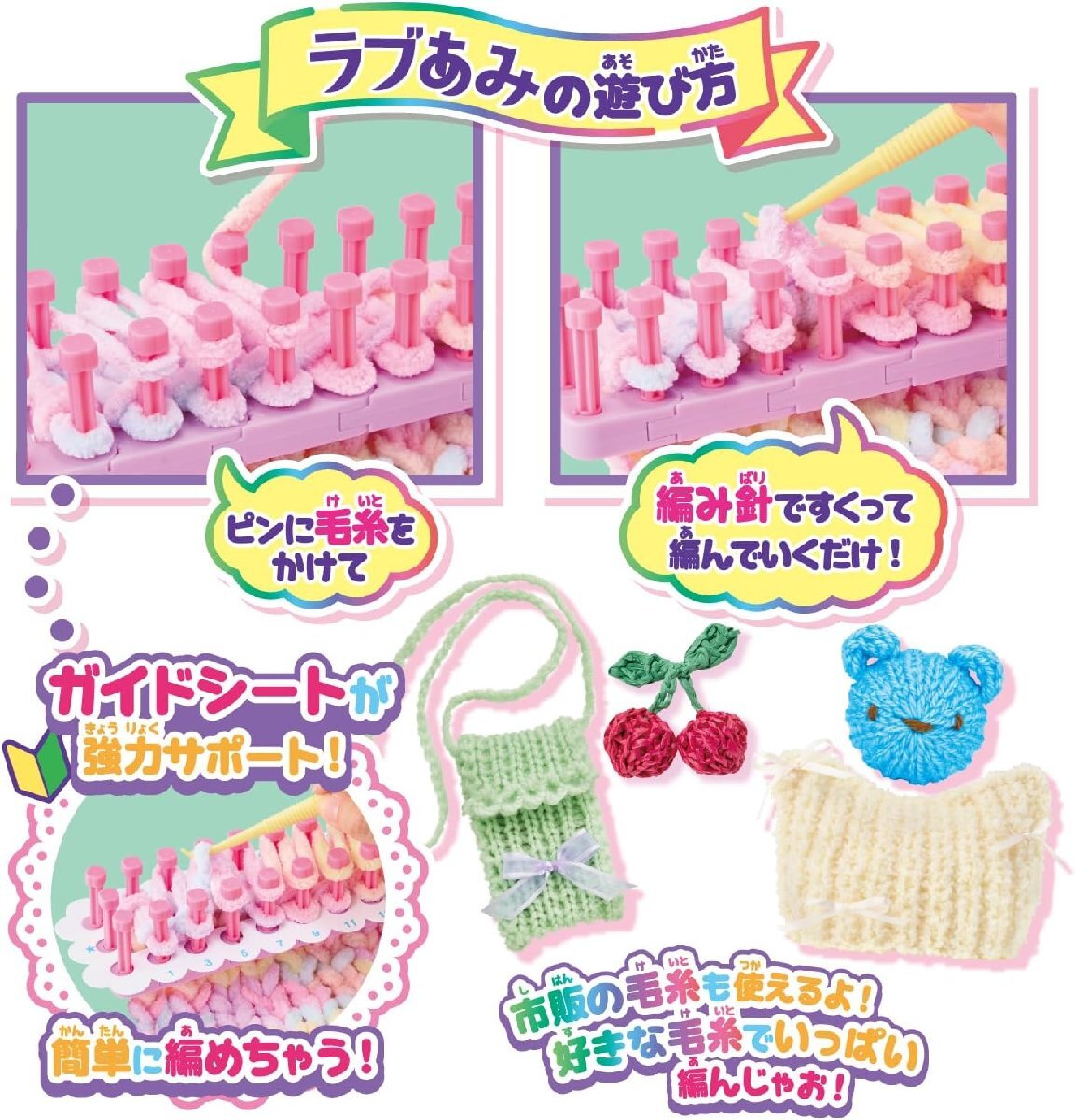 ●簡単にあみぐるみやマフラーなどのニット小物が編める編み機「ラブあみ」のプレミアムセットです。