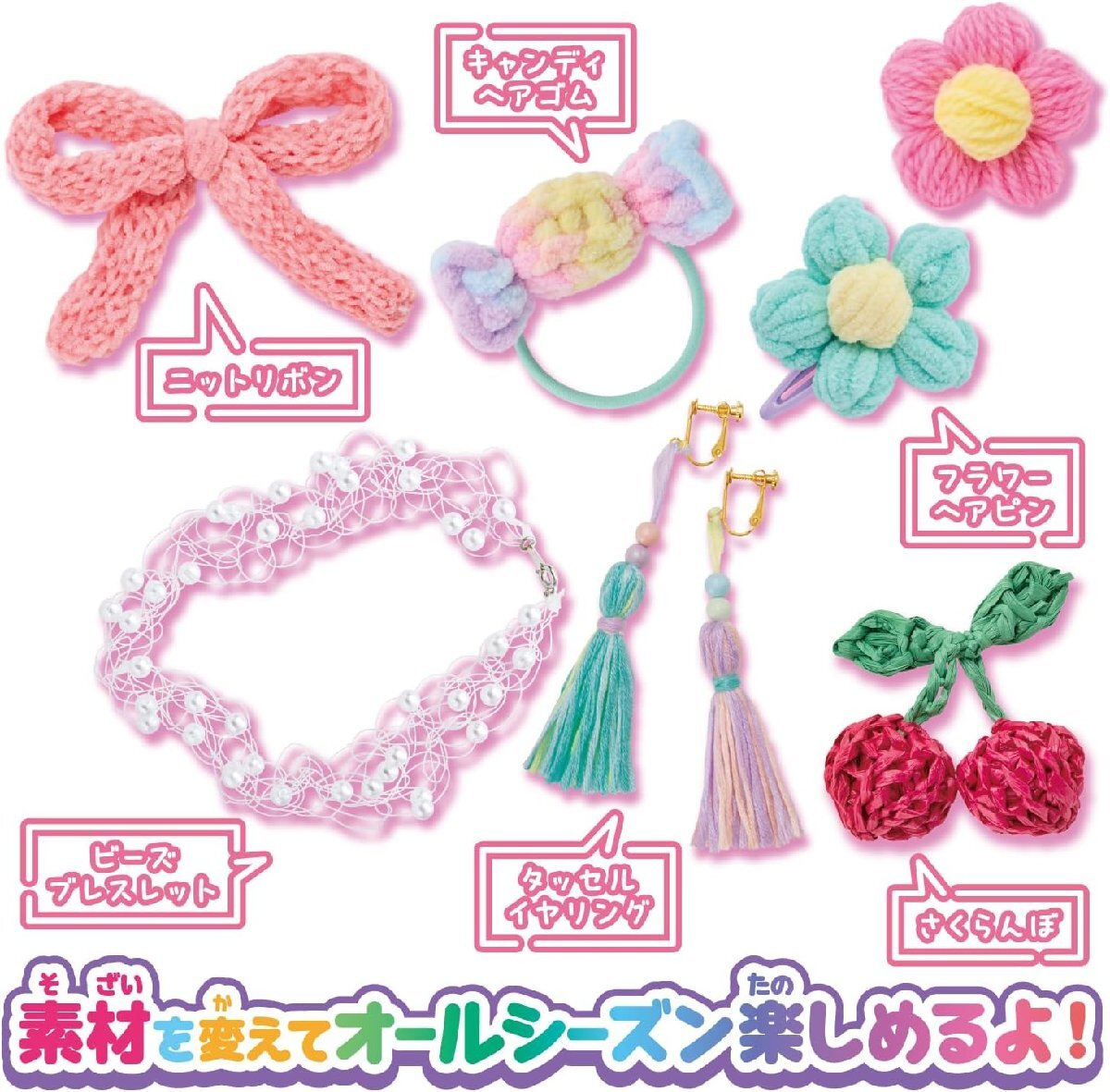 ●ふわっふわのあみぐるみやヘアアクセ、クリアポシェットなどが作れるパーツが入っています。
