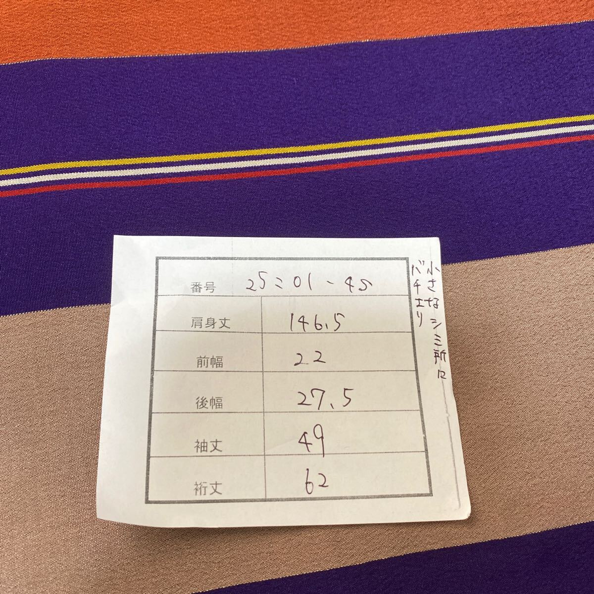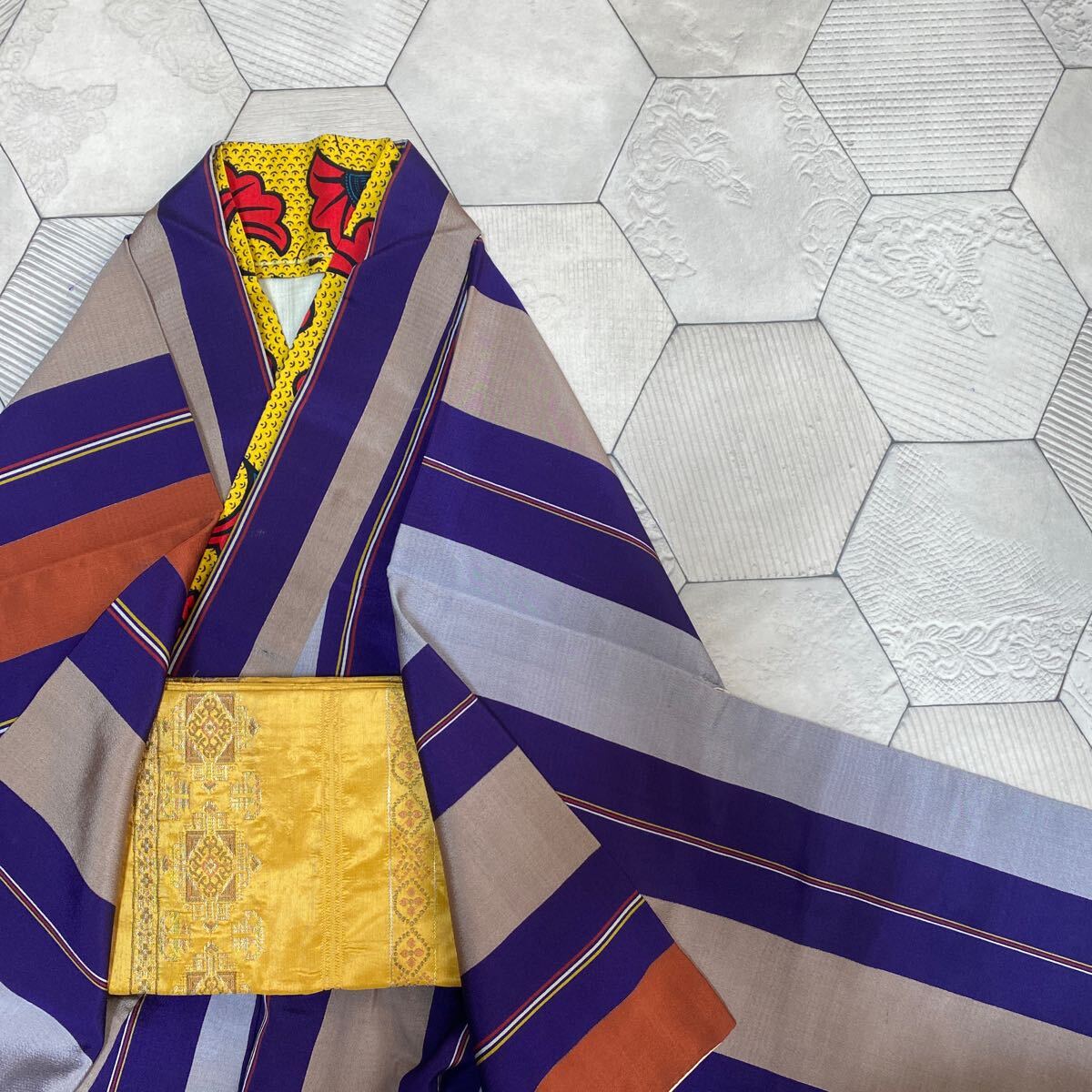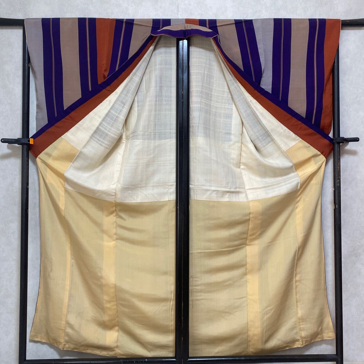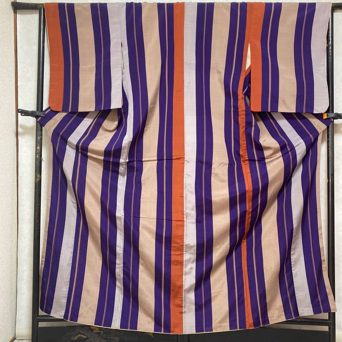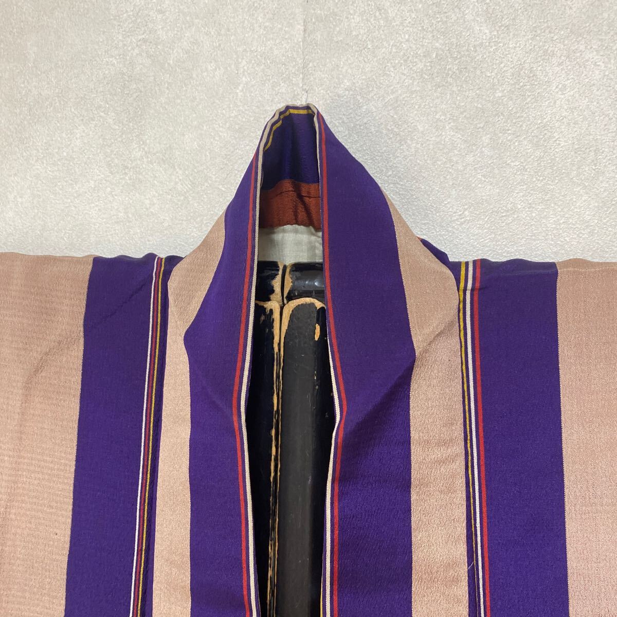 アンティーク 着物 正絹 バチ襟 縦柄 紫 オレンジ グレー昭和レトロ 大正ロマン モダン 和洋折衷コーデ リメイク 25こ01-4s
