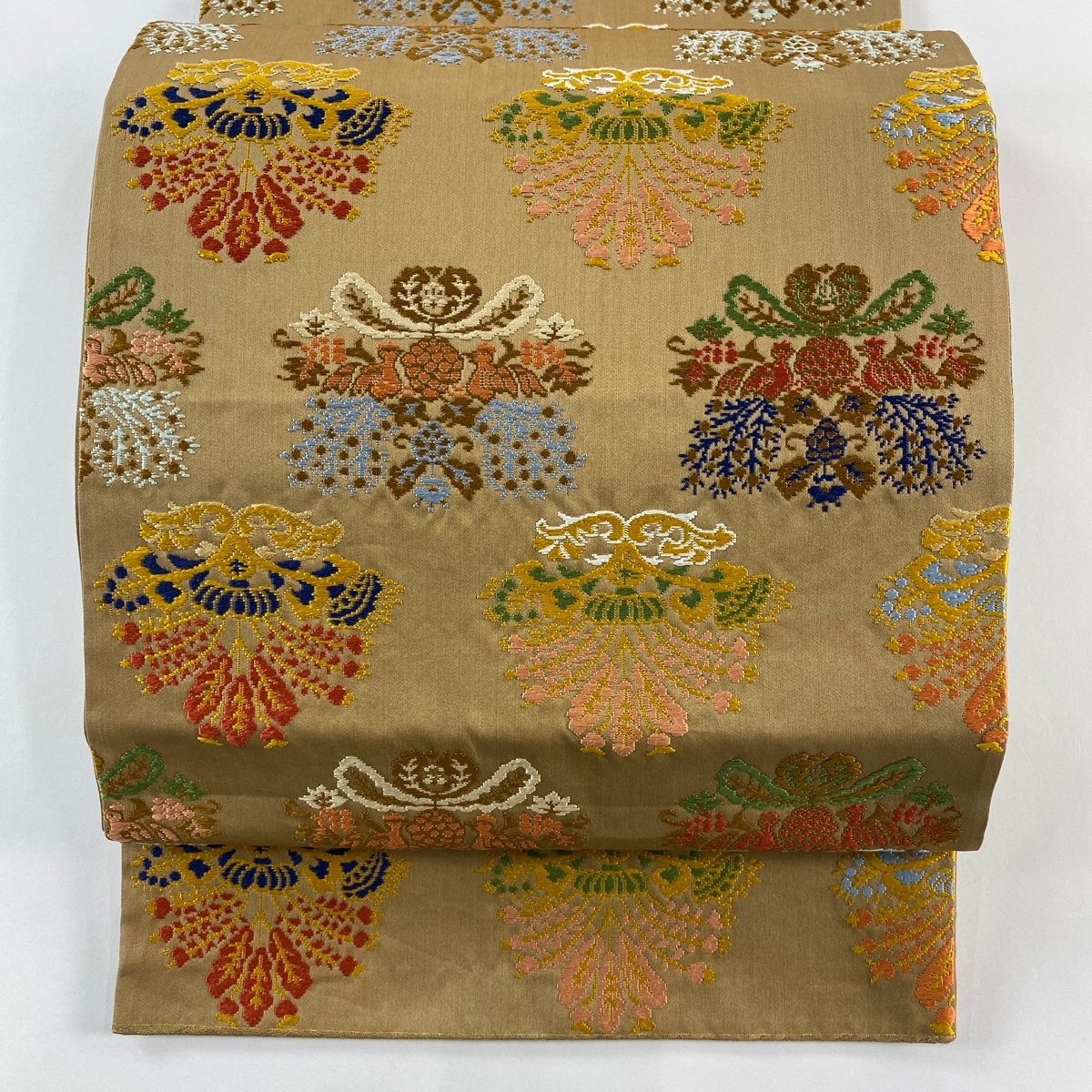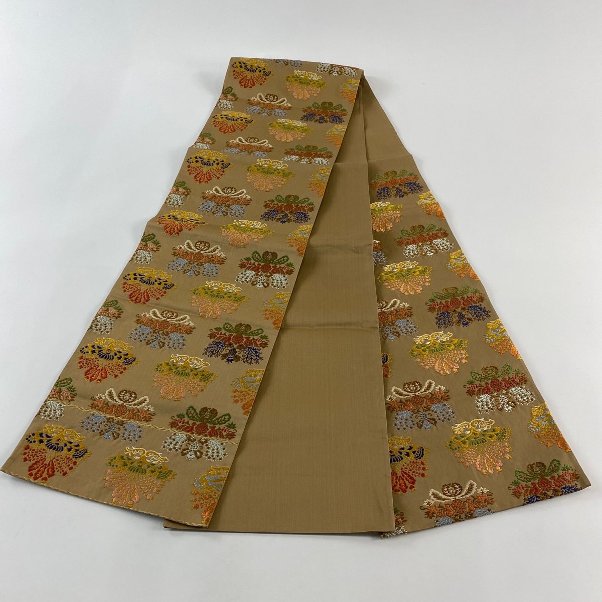 | 袋帯 秀品 関西仕立て 草花 薄茶色 六通 正絹 【中古】 |