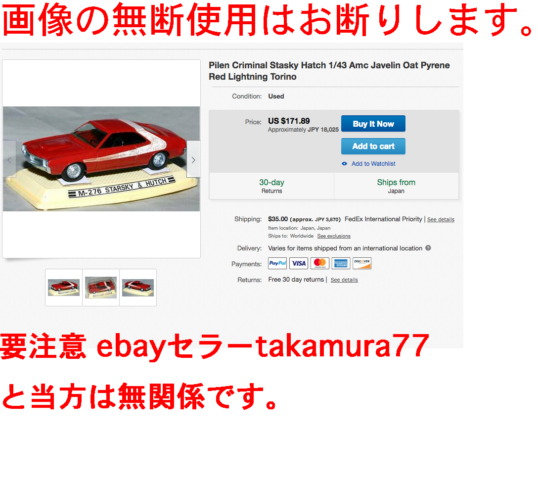 オートピレン、70年代のTVシリーズ 「刑事スタスキー&ハッチ」、ジャベリン (なぜかトリノではありません)。スケール1/43。経年劣化でシールののりシミが出ています。ゴムタイヤとプラスチック・ケースの接触面、ケース側に化学変化による溶けがあります(タイヤは問題ありません)。ケースに色あせがあります。他は良好です。珍しいモデルです。お支払いはヤフーかんたん決済のみ。東京発、ゆうパック持込60サイズ(東京700円 - 沖縄1330円)、レターパックプラス600円での発送となります。(上記の送料はこの出品物のみの料金となります。複数落札、同梱包発送の場合、重さ、サイズが変わりますので送料が変わります。)3日以内のご連絡、かんたん決済の支払期限内(通常5日、支払方法により異なります)のお支払い厳守でお願いします。入札される前に「自己紹介」もあわせてお読みください。 検索用ワード Starsky & Hutch Pilen 赤い稲妻