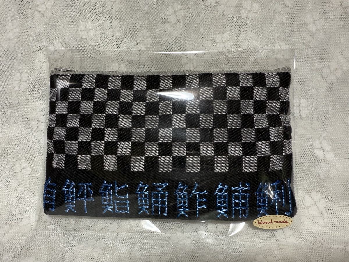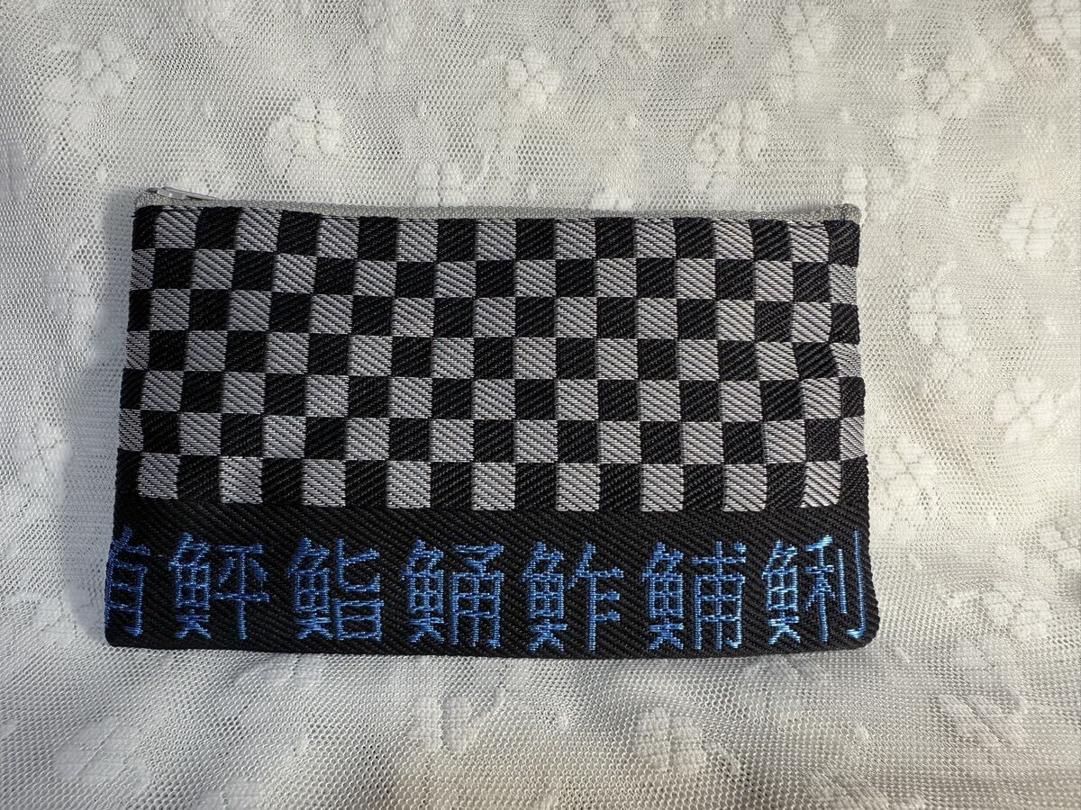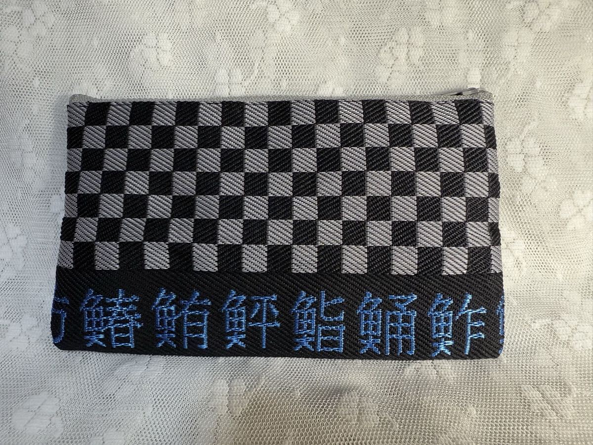 黒色とシルバーの市松模様に、魚漢字の縁を合わせています。魚漢字の青が鮮やかなので引き立ちます。