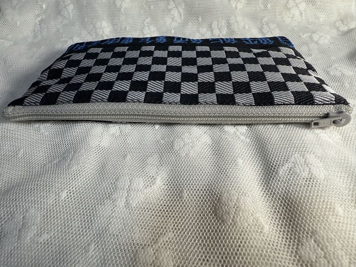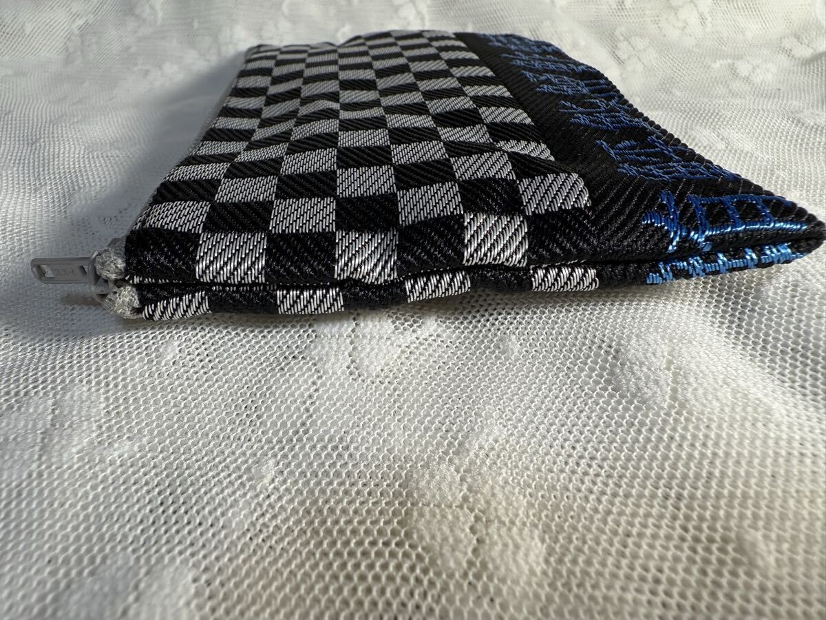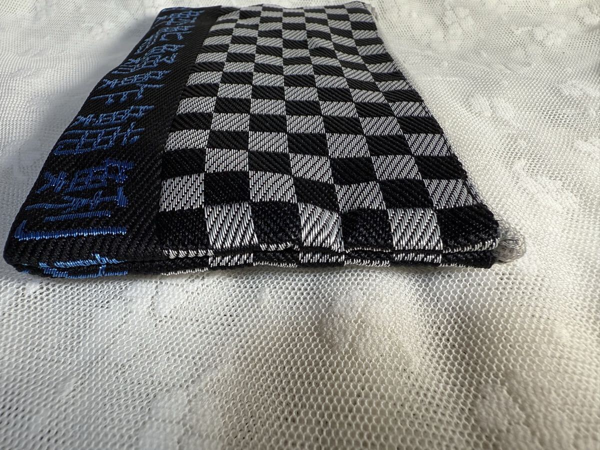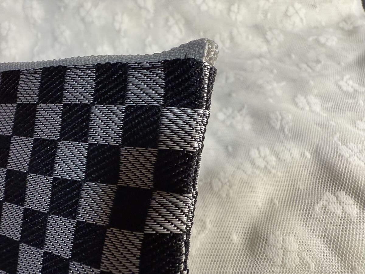 黒色とシルバーの市松模様に、魚漢字の縁を合わせています。魚漢字の青が鮮やかなので引き立ちます。