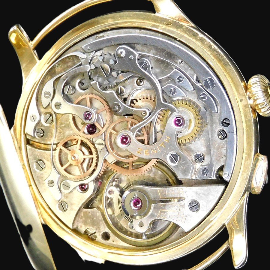 そんなゼニスも当然、1920年代に初のクロノグラフとなるタイムピースを生産している、それは懐中時計の様相を醸し出し、開閉式のハンターケースのトレンチ。文字盤は腐食しない経年の焼けが全くないポーセリングを採用している。1920年代ということもあり、40MM近い大きなケースを採用している。今回の逸品を見てみよう。39MM近い18金無垢ケース、1920年代の特長であるラグの部分は脱着できないハメゴロシと呼ばれるピンがケースにダイレクトに留められている。特に今回のケースはラグ部分が、ケースの内側にあることで、ハメゴロシとなるラグピンが湾曲しなければ、ストラップにとりつけることが出来ず、今回のラグピン部分を見ても、かなり大きく湾曲している。クロノグラフのスペックは30秒積算計に60秒に永久秒針を3時位置に配している。当然、スタート、リセット式のワンプッシュクロノグラムラフということもあり、キャリバーはパルジュ22、正式に機械のテンプ位置にキャリ番号の刻印がないことで、GHTキャリとなる。文字盤はピュアホワイトの陶器製のポーセリング文字盤で、特有のヒビは全くなく状態としても、ケースに小さな打痕があるが、100年以上経っているが状態は完ぺきと言っても過言ではない。