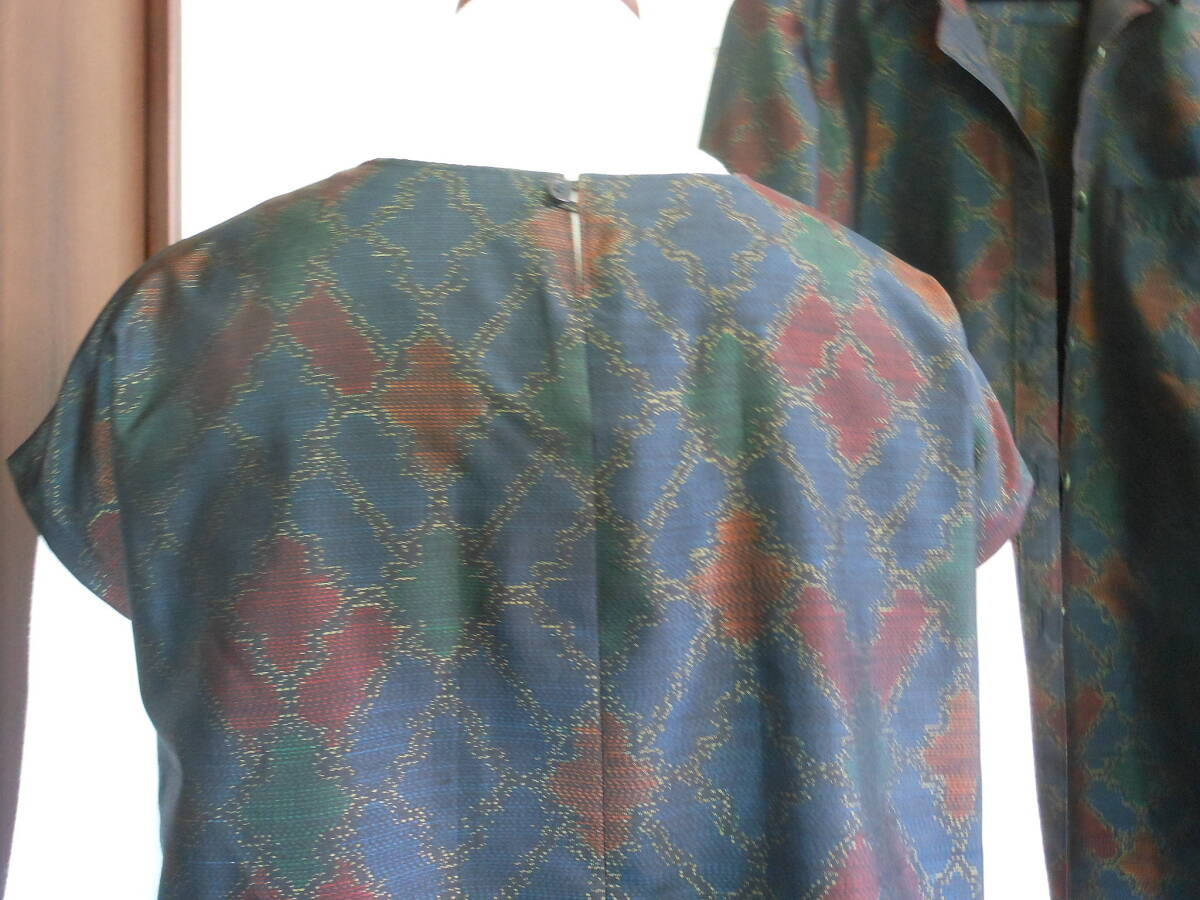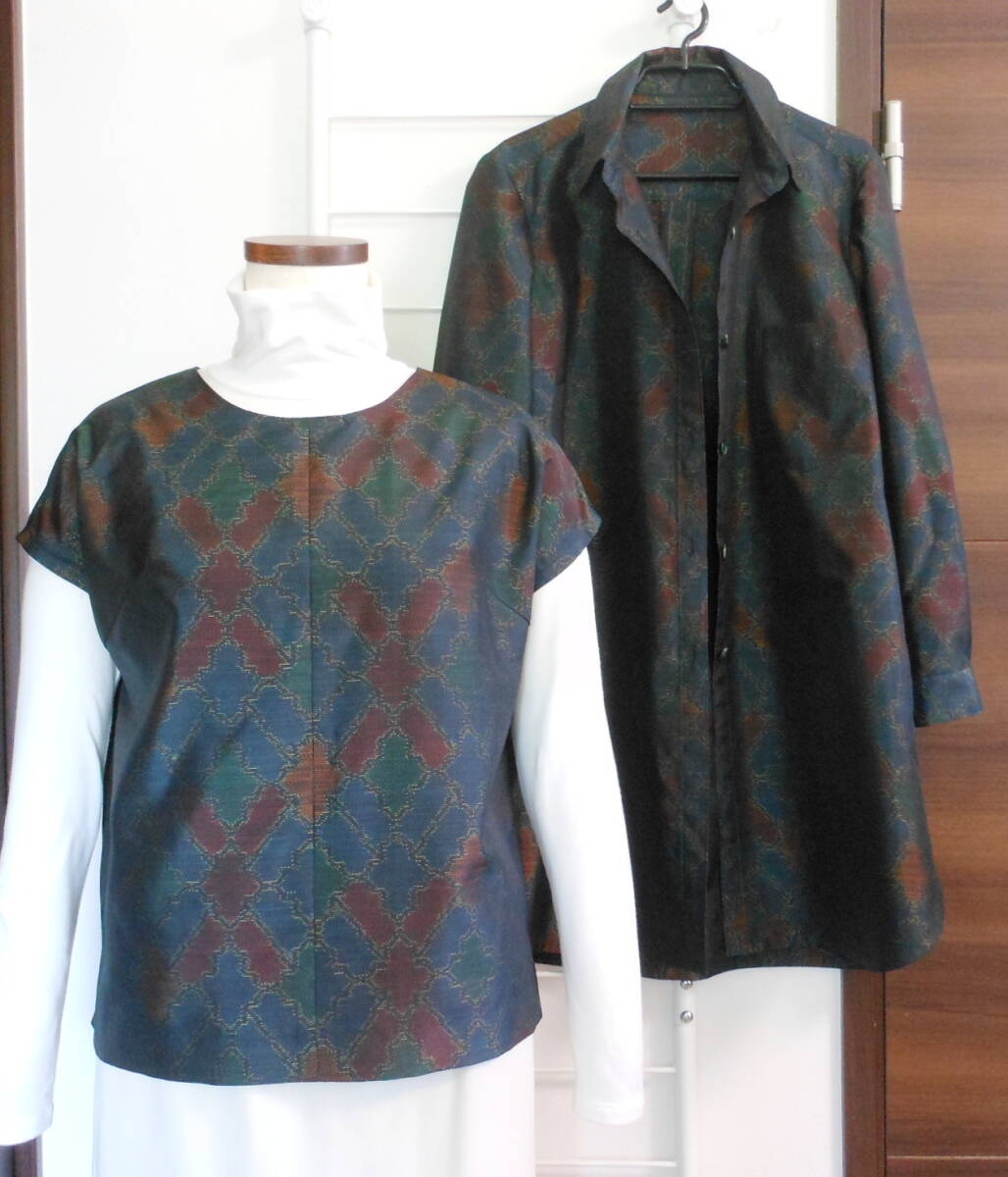 正絹の大島紬の着物からシャツジャケットとインナーブラウスのアンサンブルです。