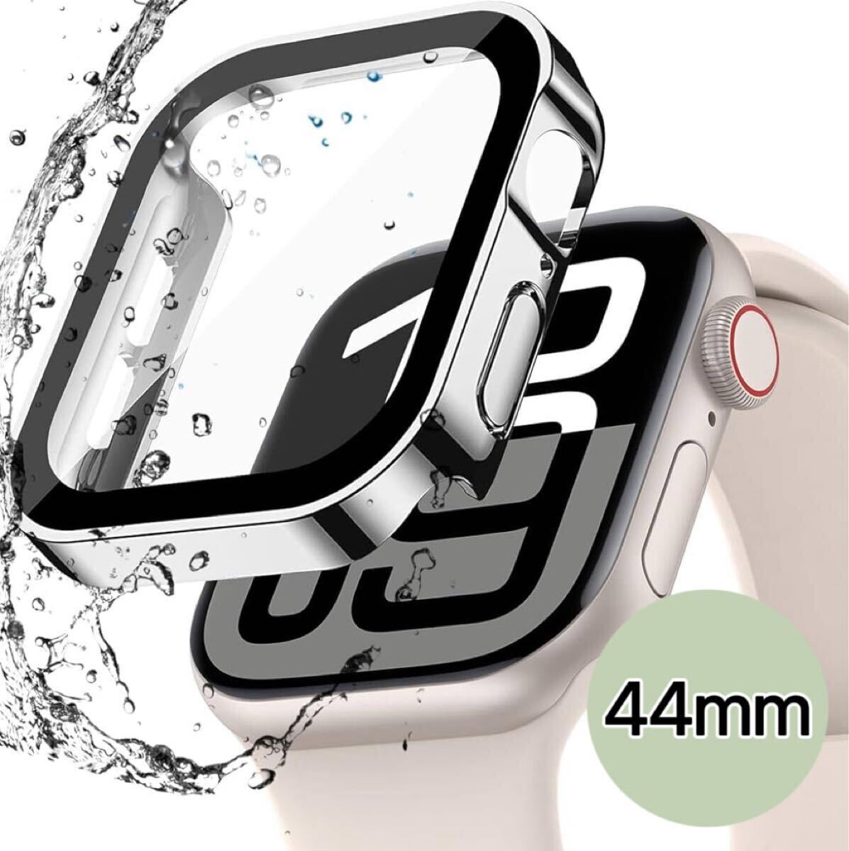 Apple watch ケース 防水 3D直角エッジ 超薄型 PC+ガラス素材 キズ防止 全面保護 光沢のシルバー 44mm