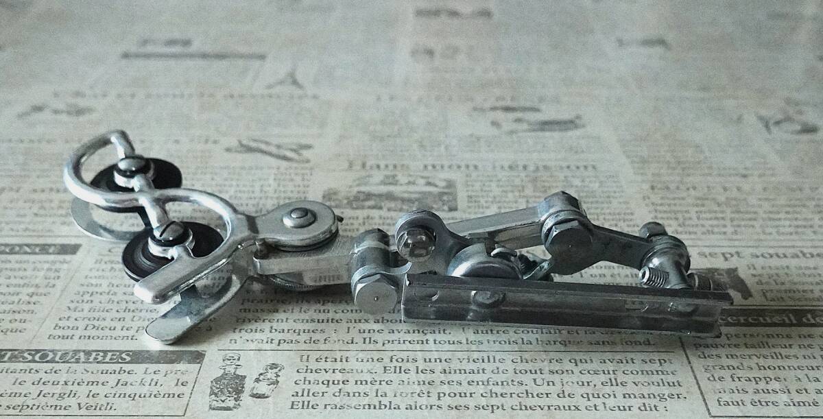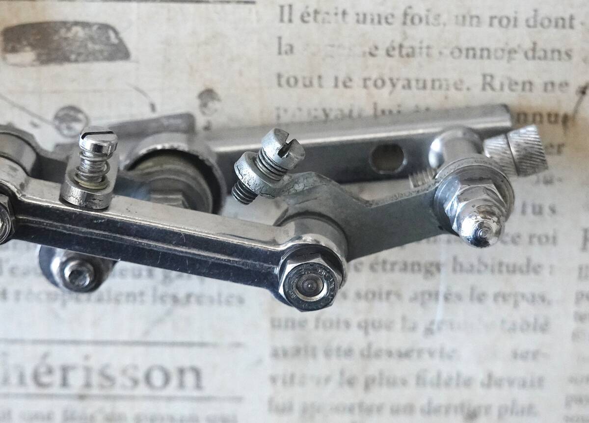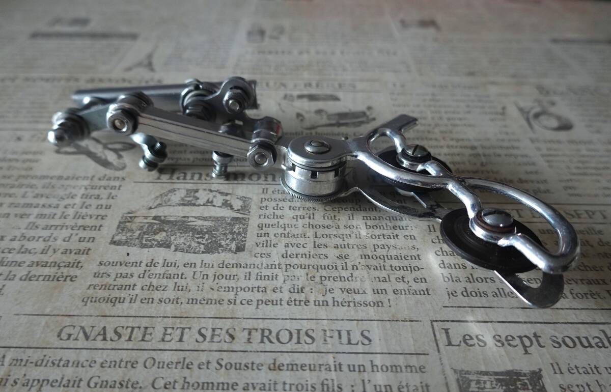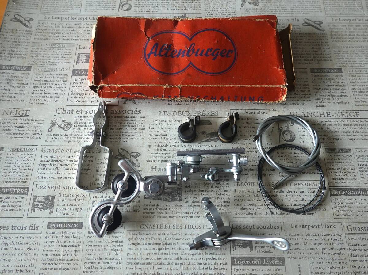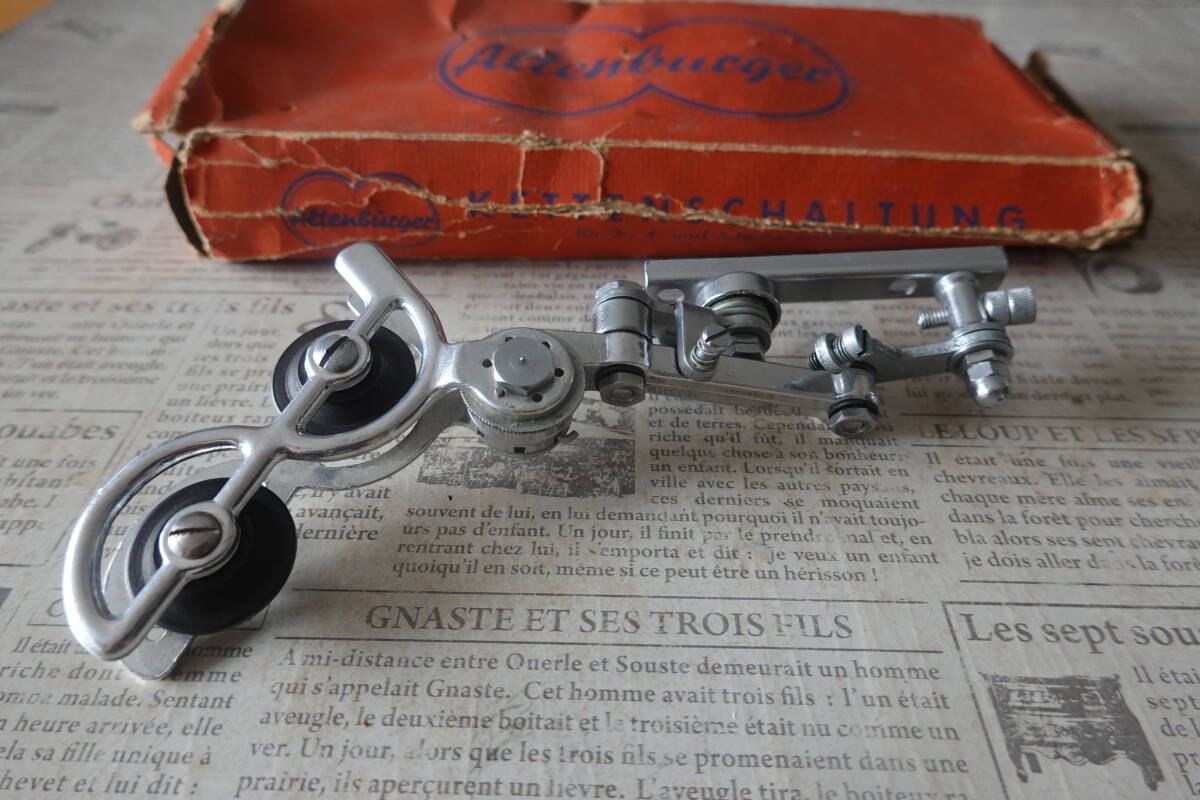ご欄頂きありがとうございます。“アルテンバーガー(Altenbuger)”RDの箱入り未使用品です。”アルテンバーガー”は当時の西ドイツの総合自転車部品メーカーでディレイラー以外ではハブやステム、ブレーキなどを生産していて“ひょうたん”型の社マークが特徴的でした。本機は1955年頃に発表されたRDでチェーステー下部に取り付けてパンタグラフ式の変形型であるベルクランク方式でチェンジする特殊な機構です。キャパシティは13T、3Sか4S用と思われます。なお箱はボロボロですし、また手で左右に動かすとカクンカクンとスムーズに動きませんので支点(写真8枚目)のボルト穴を金ヤスリで少し削る作業が必要です。あくまでコレクション用ですがポタリング車などに付けて遊ぶのも面白いと思います。¥500の廉価で出品しますのでノークレーム、ノーリターンでお願いいたします。