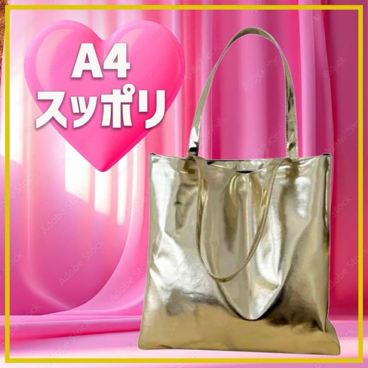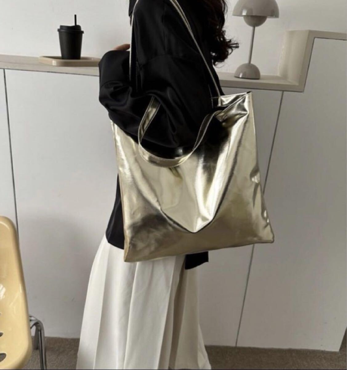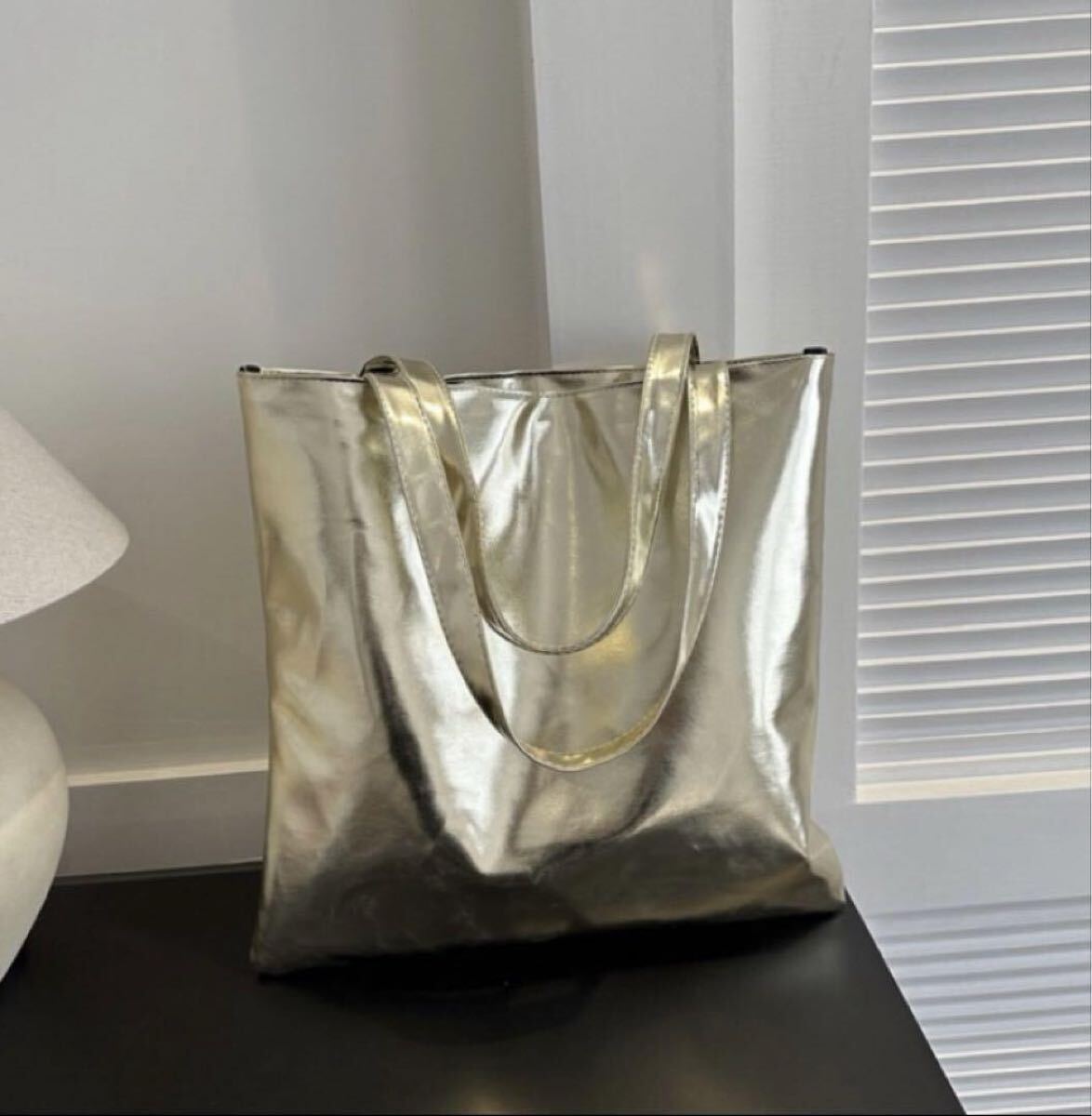 ファスナー付きの大容量ゴールドトートバッグ、メタリック素材でスタイリッシュ。