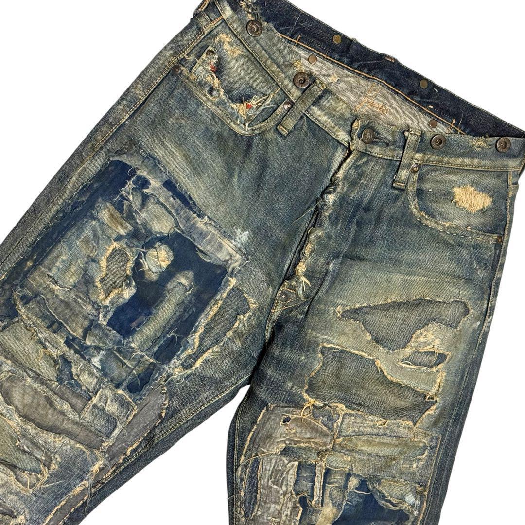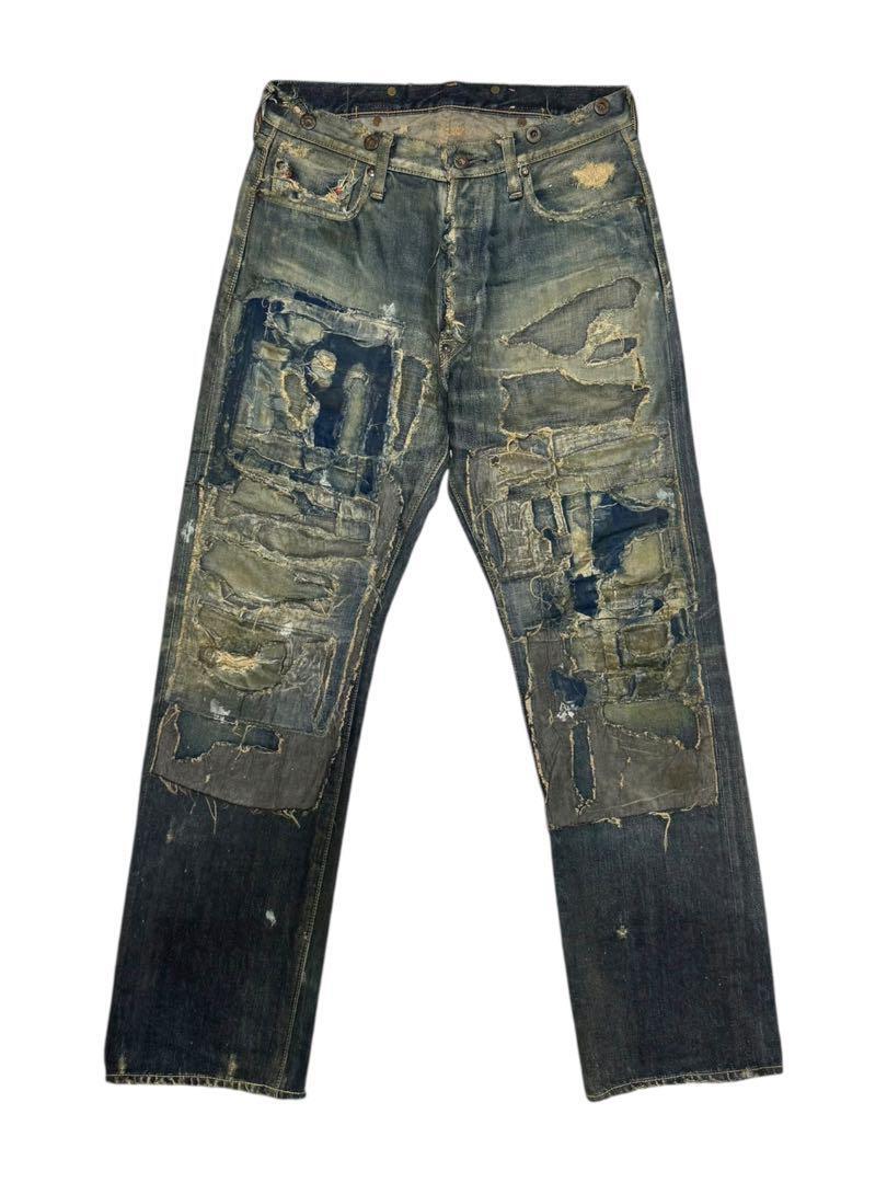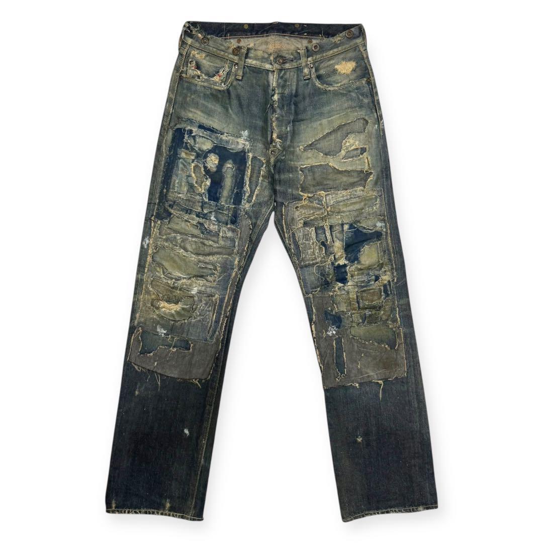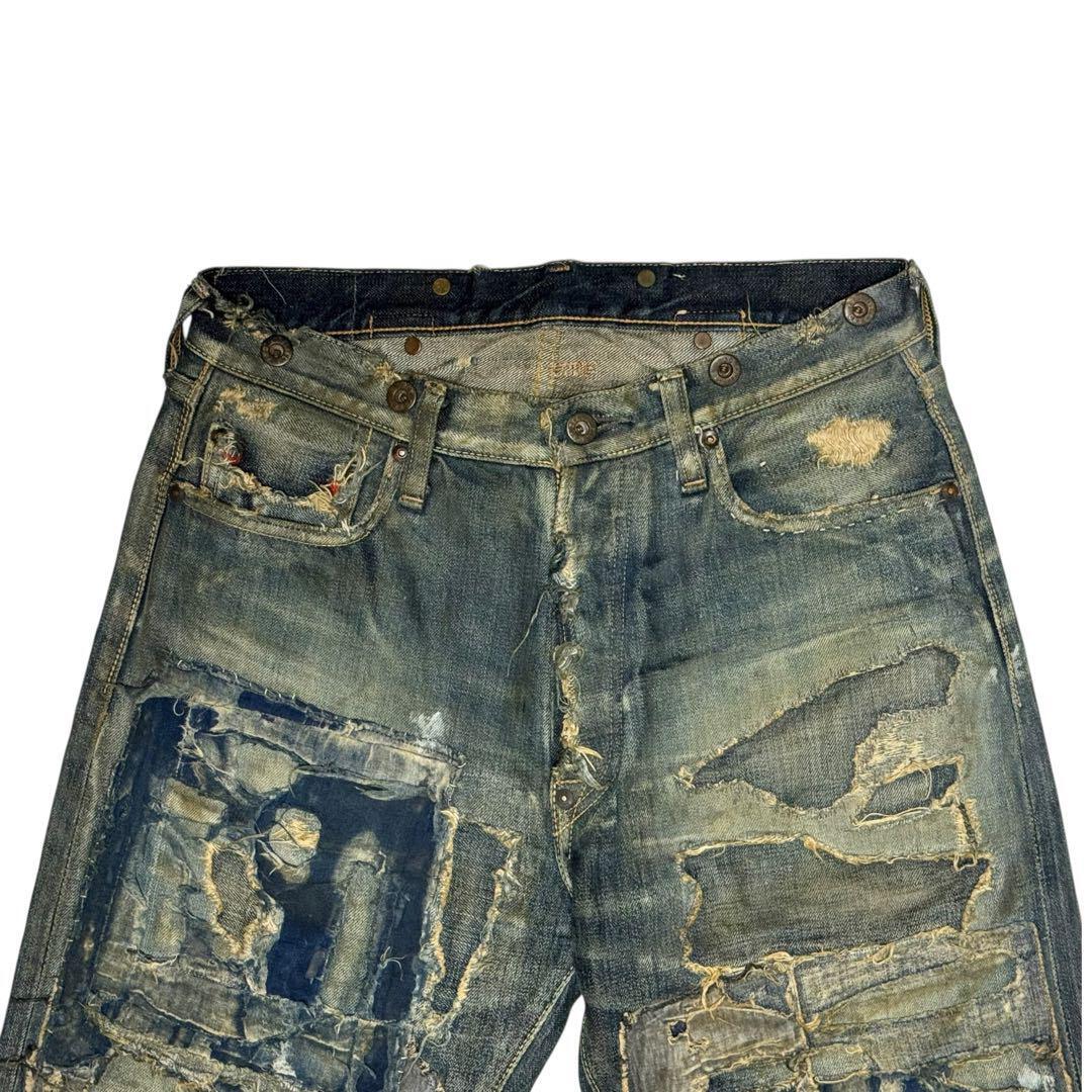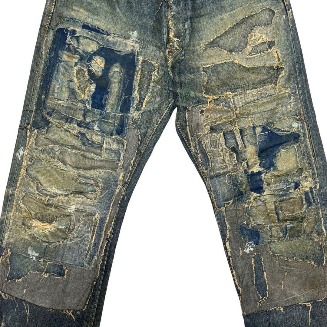 パッチワークデザインのダメージ加工ストレートデニム。