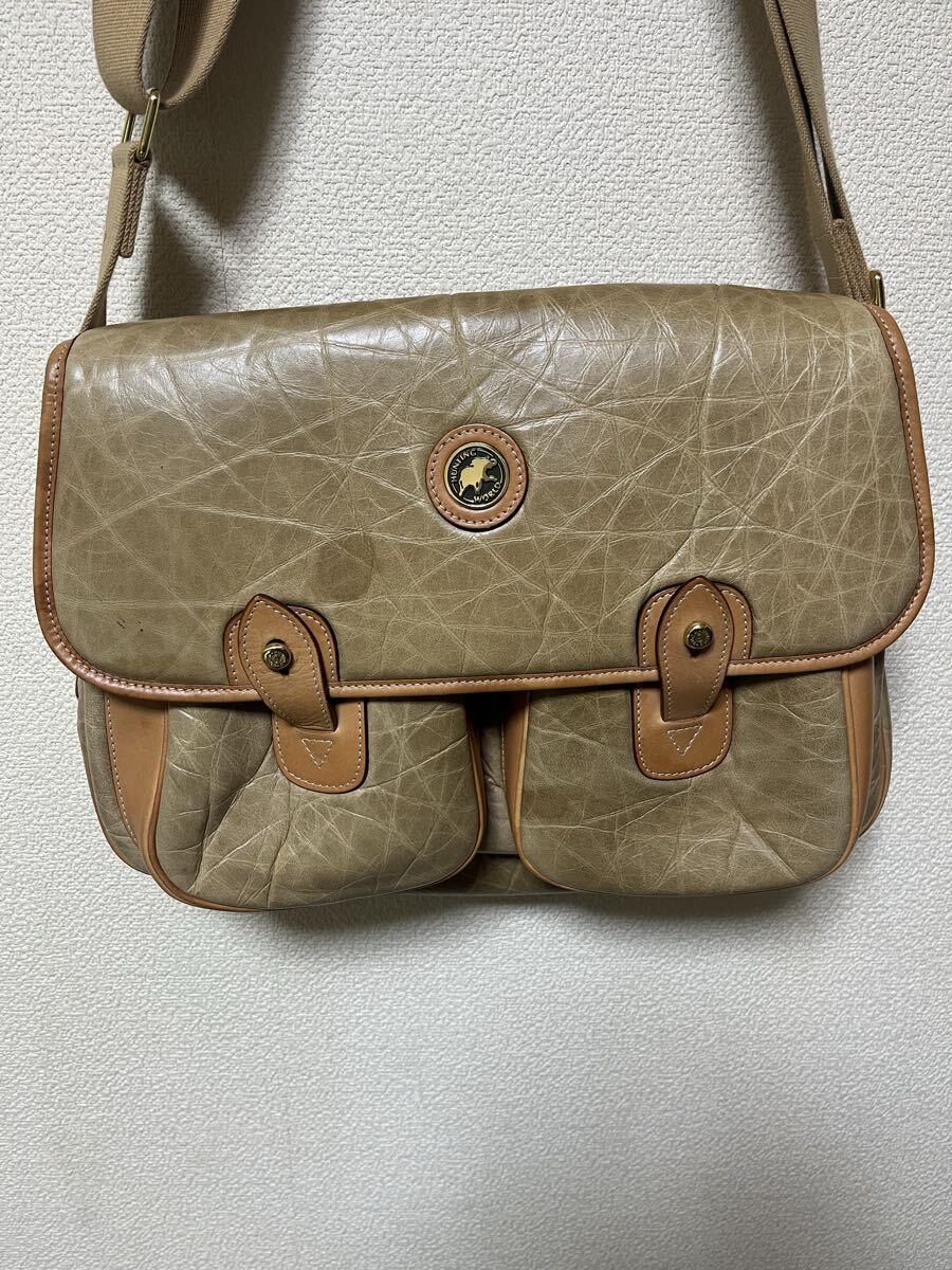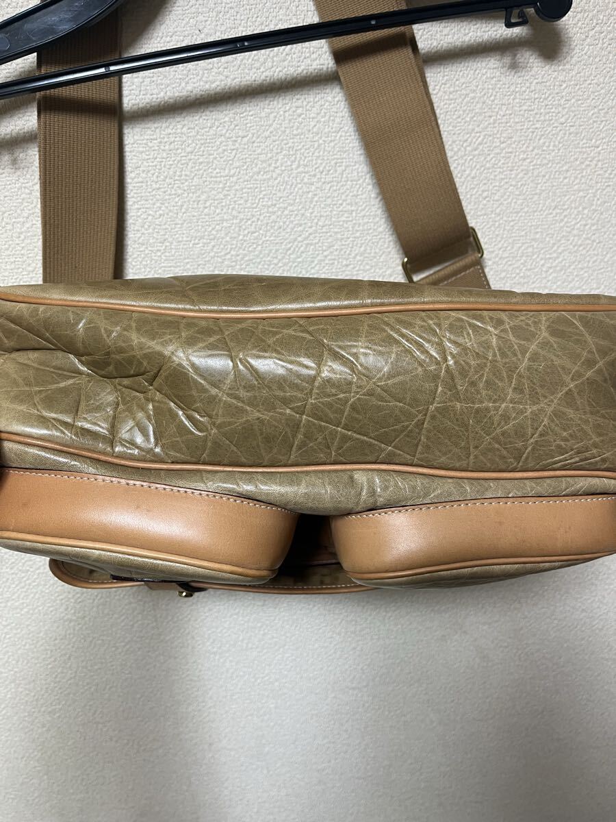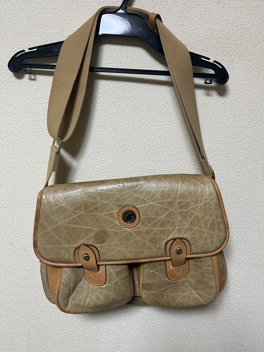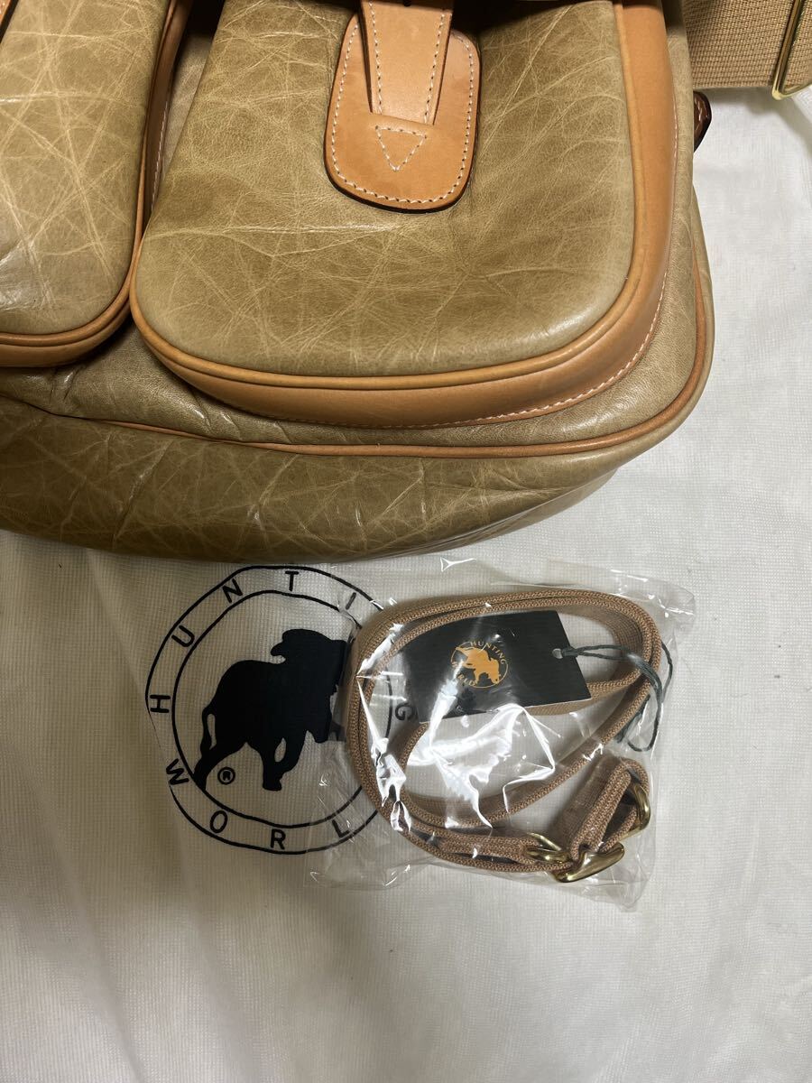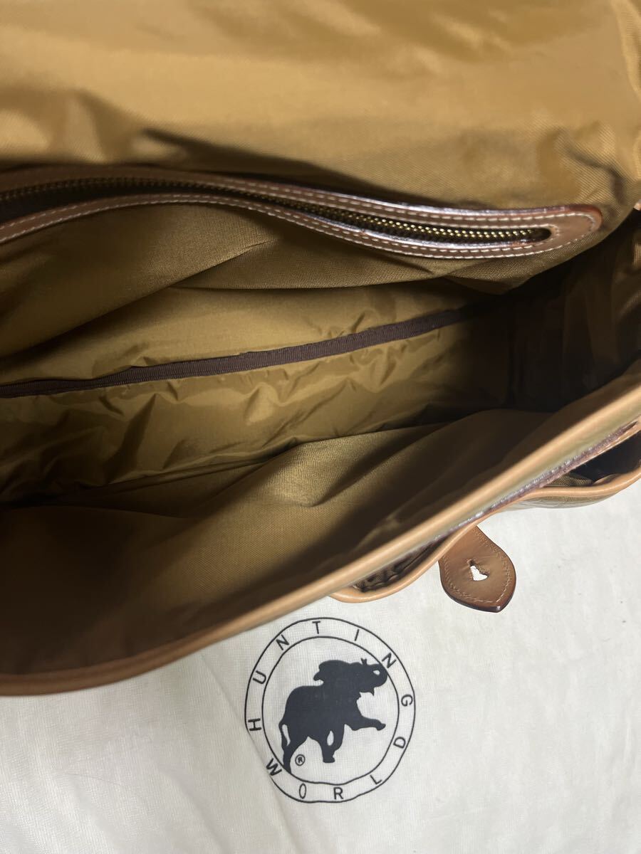 ハンティングワールドのバチューサーパス レザー ショルダーバッグです。カラーはベージュ系、大きさはだいたい横38センチ、縦27センチ、まち10センチ程度。シミ汚れありますがそれ以外はとても綺麗です。新品から使用回数少ないのでこれからガンガン活用できます。ハンティングワールドは定価20万円以上とかしますのでこの機会にどうぞ。配送は定形外かゆうパック元払い。