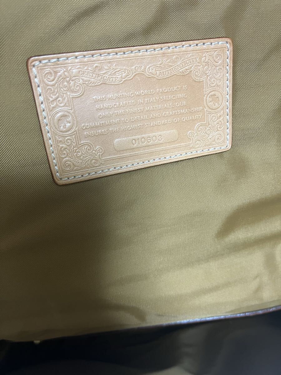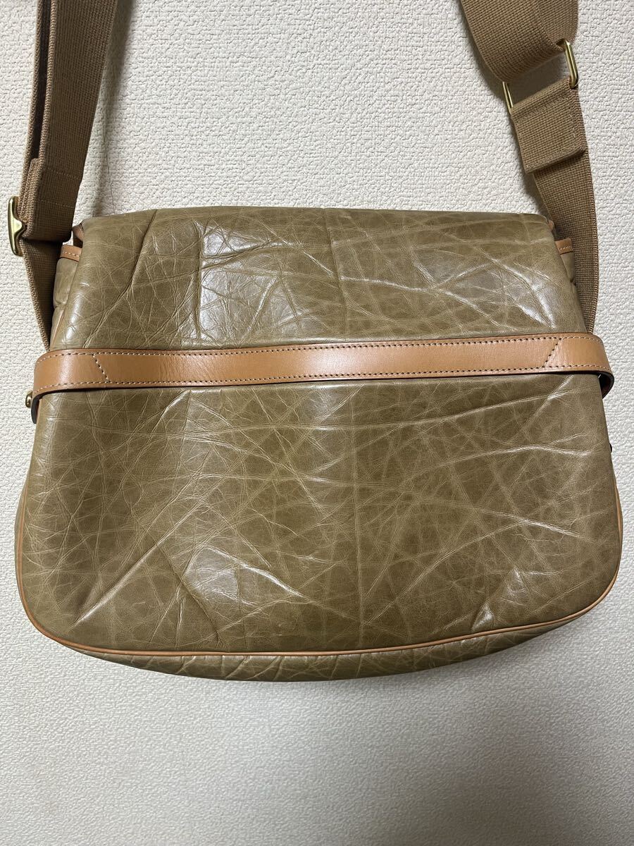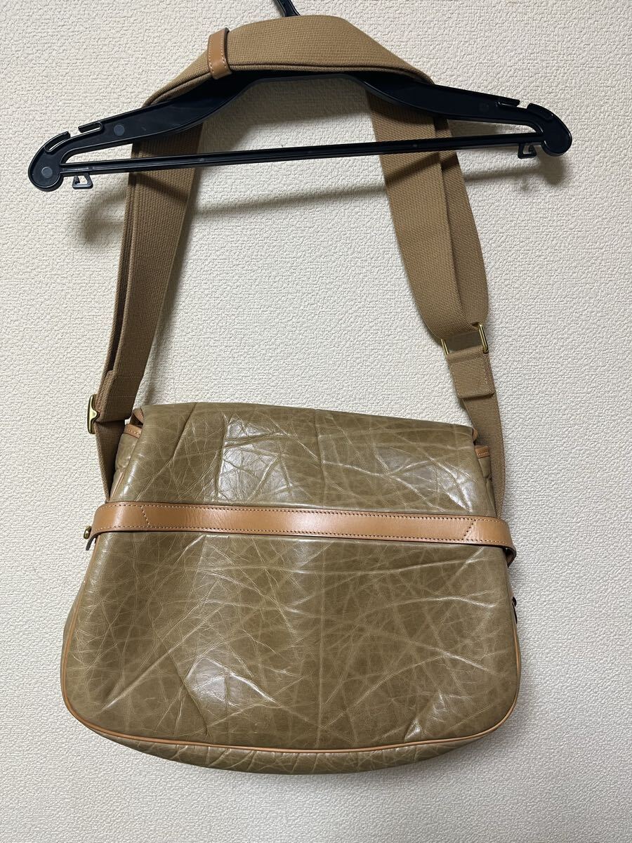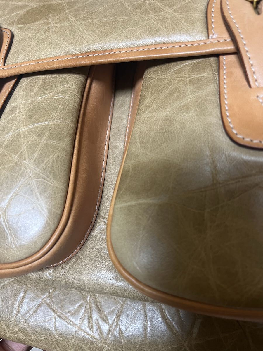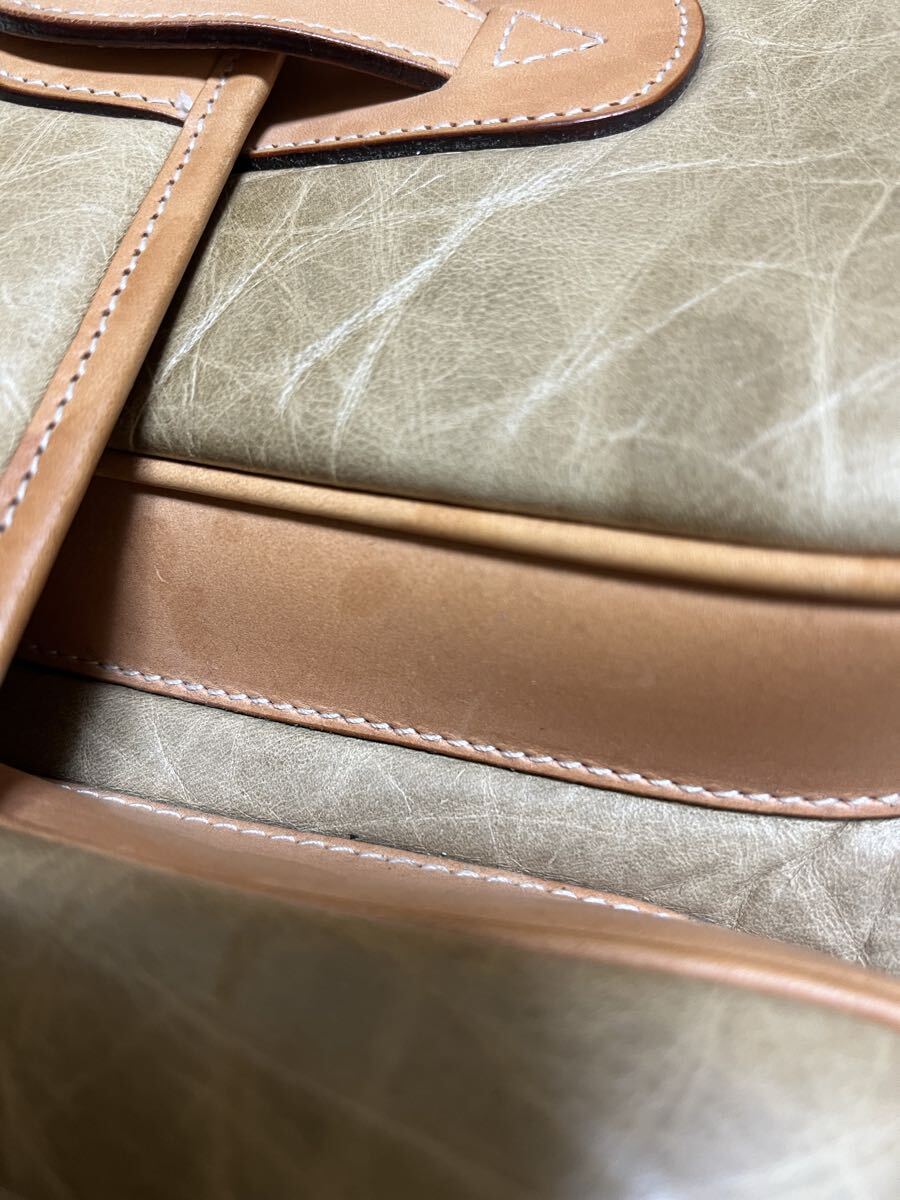 ハンティングワールドのバチューサーパス レザー ショルダーバッグです。カラーはベージュ系、大きさはだいたい横38センチ、縦27センチ、まち10センチ程度。シミ汚れありますがそれ以外はとても綺麗です。新品から使用回数少ないのでこれからガンガン活用できます。ハンティングワールドは定価20万円以上とかしますのでこの機会にどうぞ。配送は定形外かゆうパック元払い。