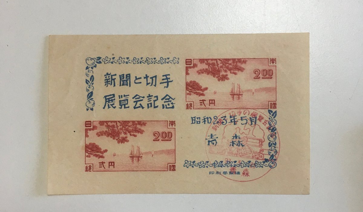 | 昭和23年 新聞と切手展覧会 青森 2円×2枚切手シート 消印あり | ||||