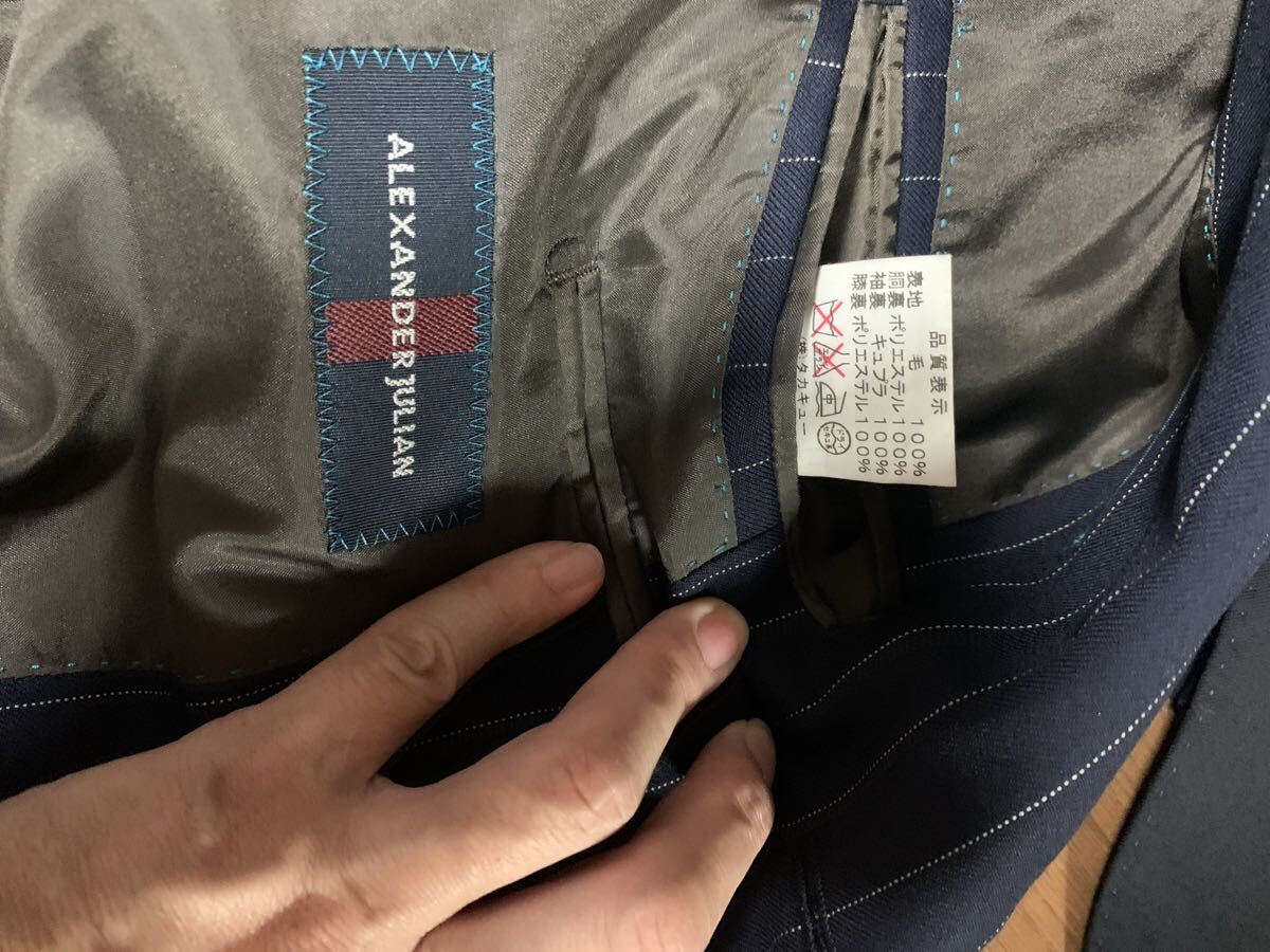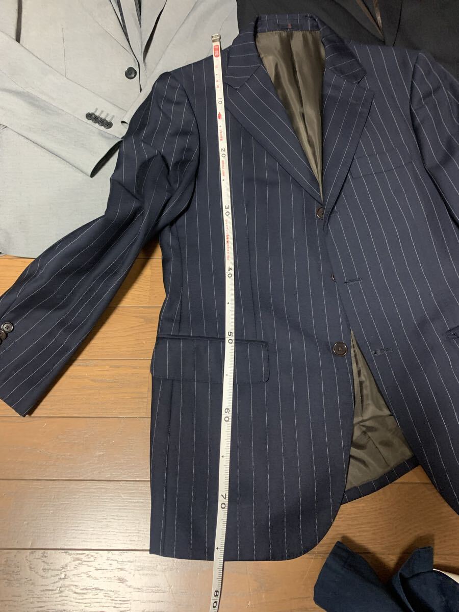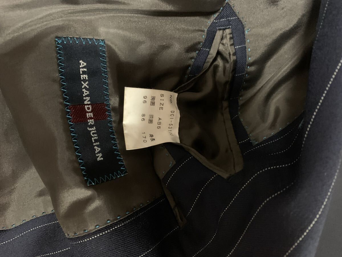 ネイビーのストライプデザインのビジネスジャケットセット、洗練されたスタイルでビジネスシーンに最適。