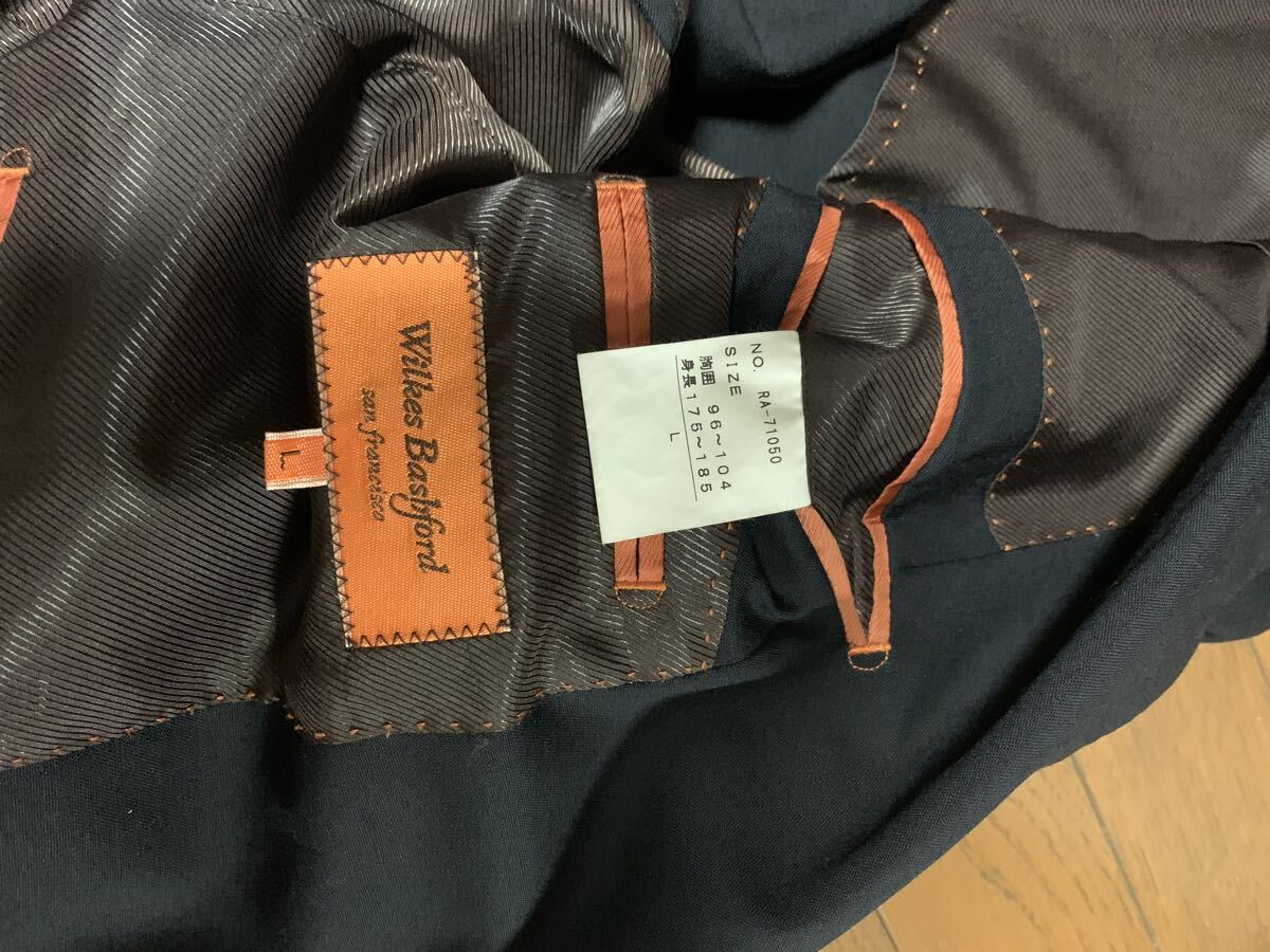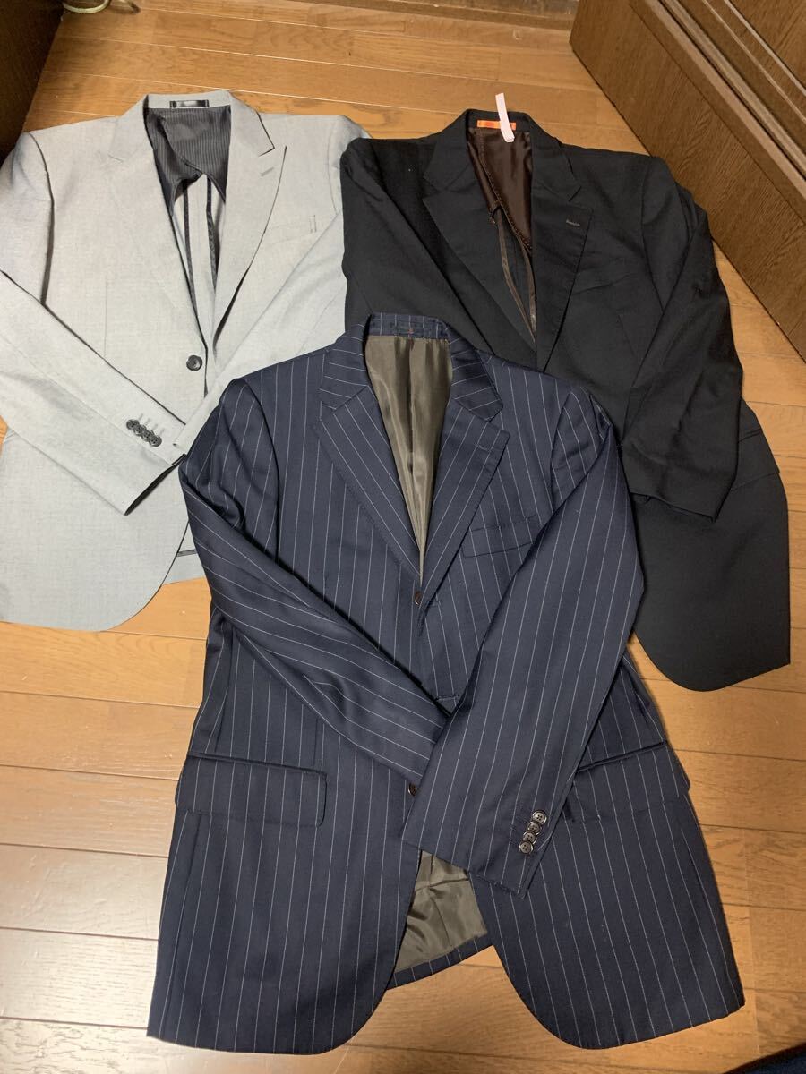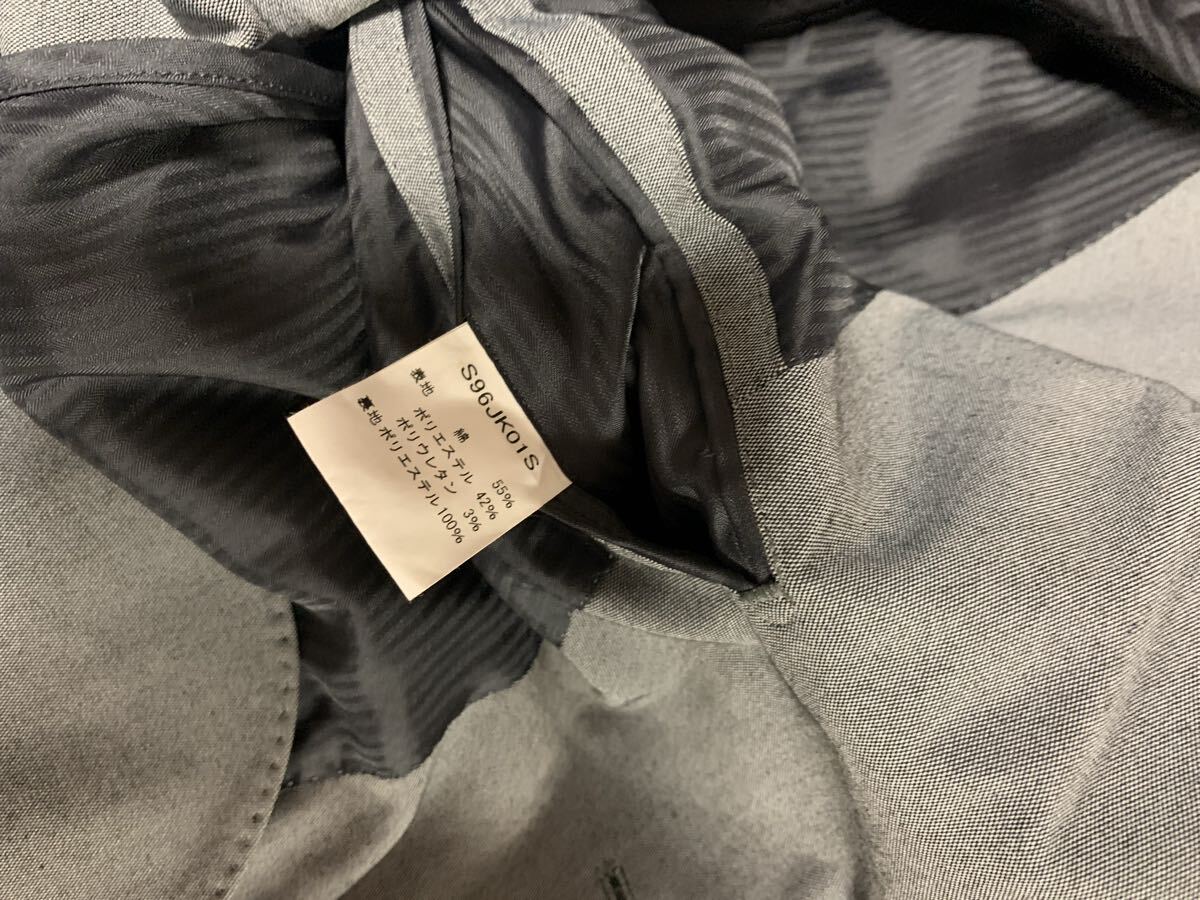 ネイビーのストライプデザインのビジネスジャケットセット、洗練されたスタイルでビジネスシーンに最適。