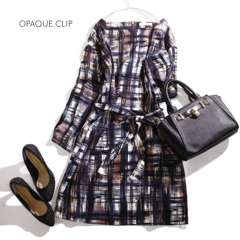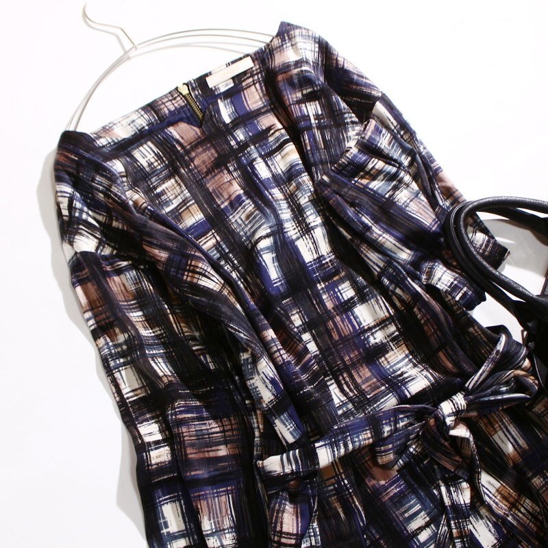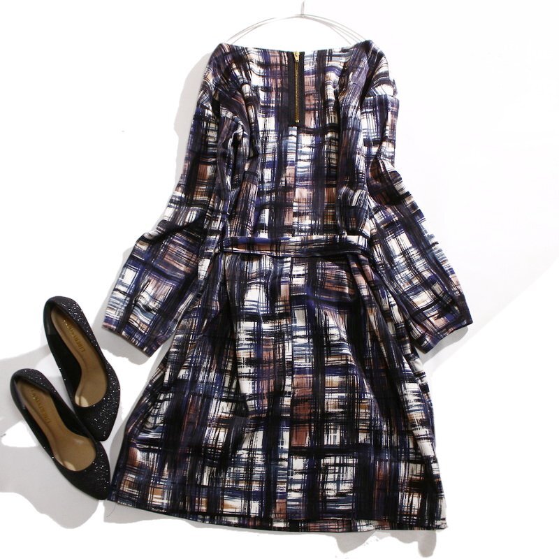 美品 オペ―ク OPAQUE 株)ワールド 合物 まだら 格子柄 プリント 艶 サテン 長袖 ワンピース 9号 38 ネイビー 紺 ホワイト 白 ポリエステル