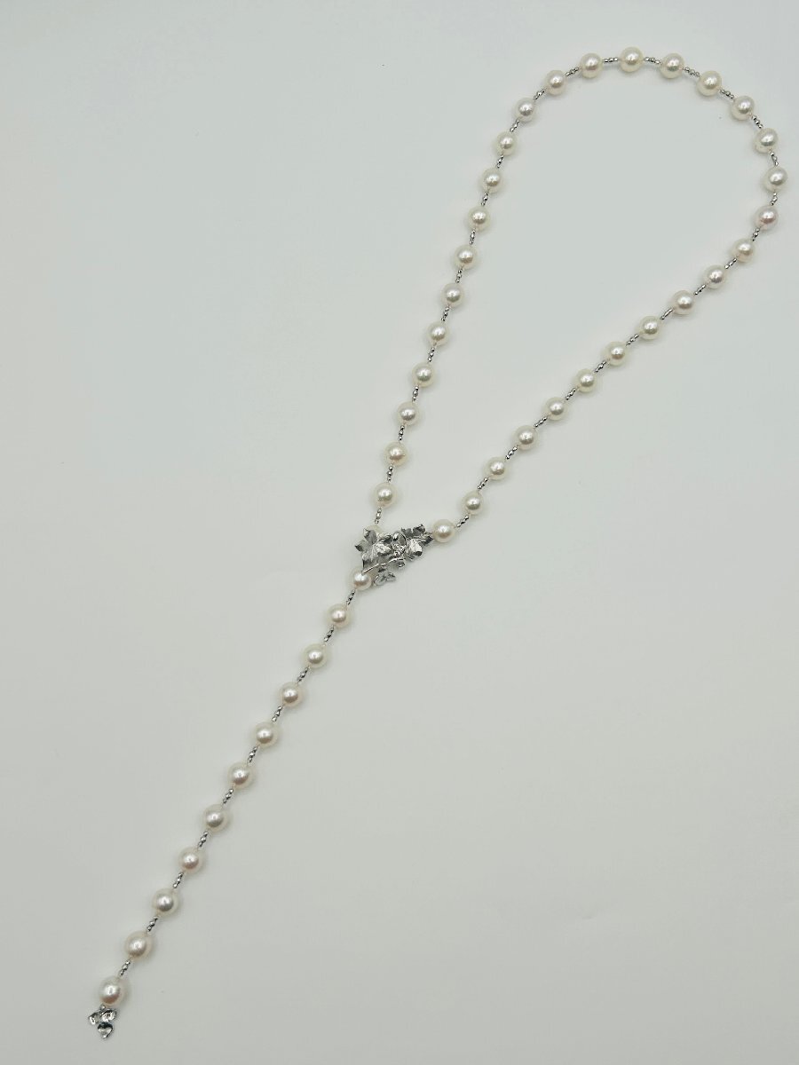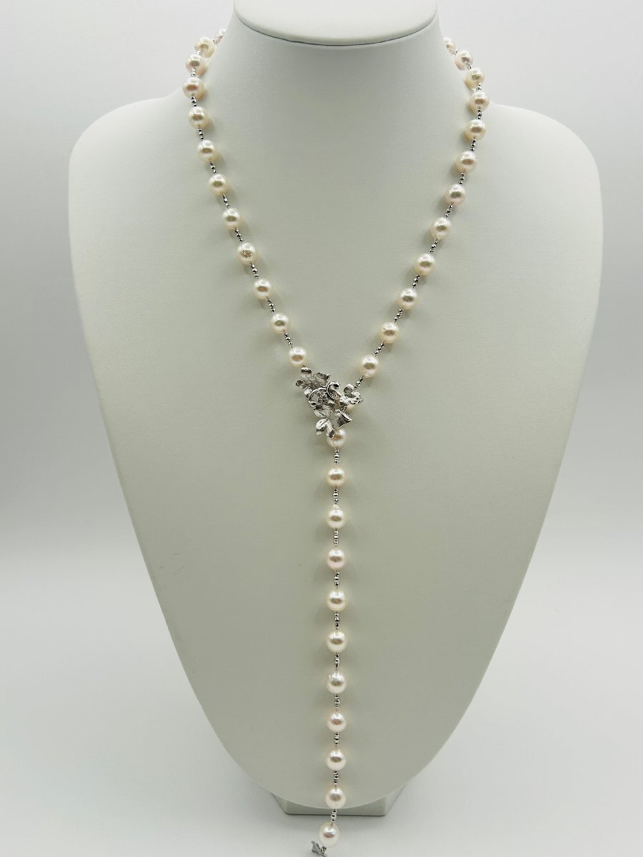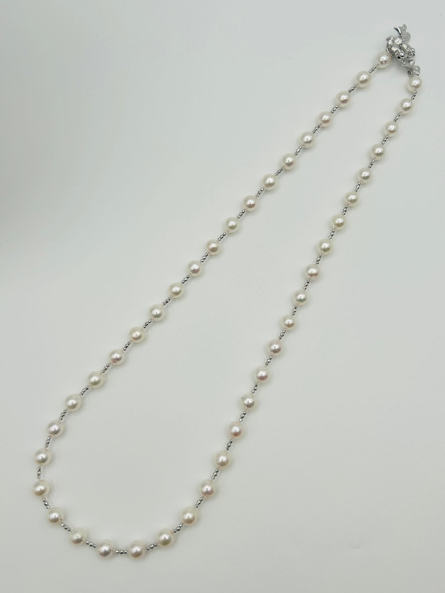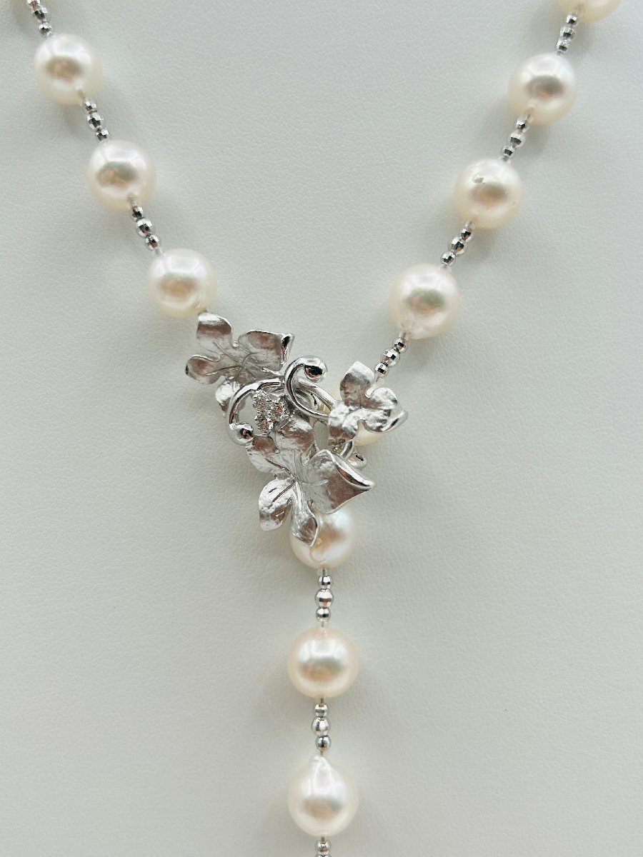 アコヤパールの8.5-9.0mmを使ったステーションネックレスです。 クリップクラスプを使った2WAYでロングで使用または6枚目のようなY字の形でのご使用もおすすめです。 アコヤパールに花型のパーツを合わせた存在感が抜群の商品です。 カジュアルで普段使いに便利なネックレスです。お求めやすい価格で出品いたします。 現品限りのお値打ち価格でご提案いたします! |