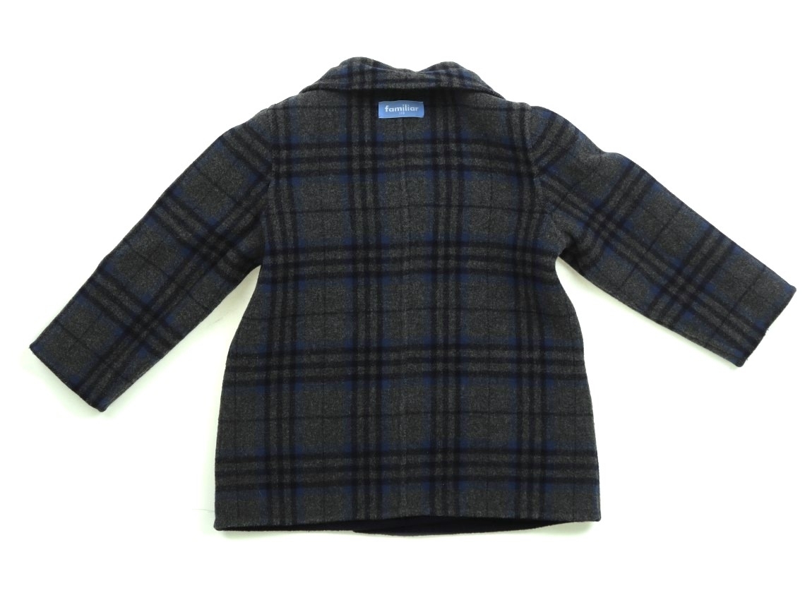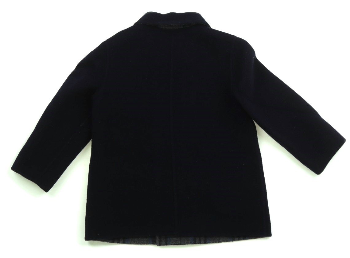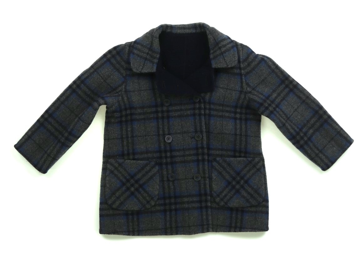ウール・ナイロン素材のダブルフェイス地。リバーシブル仕様。無地側の一番下のボタンが欠損しています。全体的に毛羽立ち・毛羽の付着が見られます。