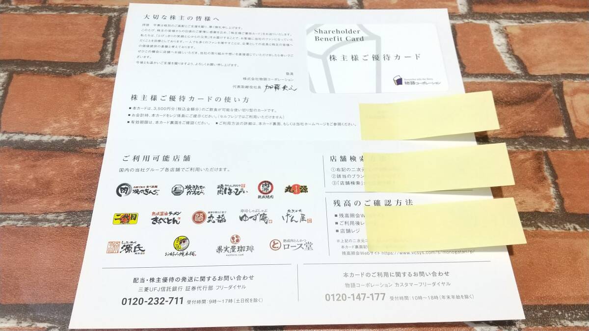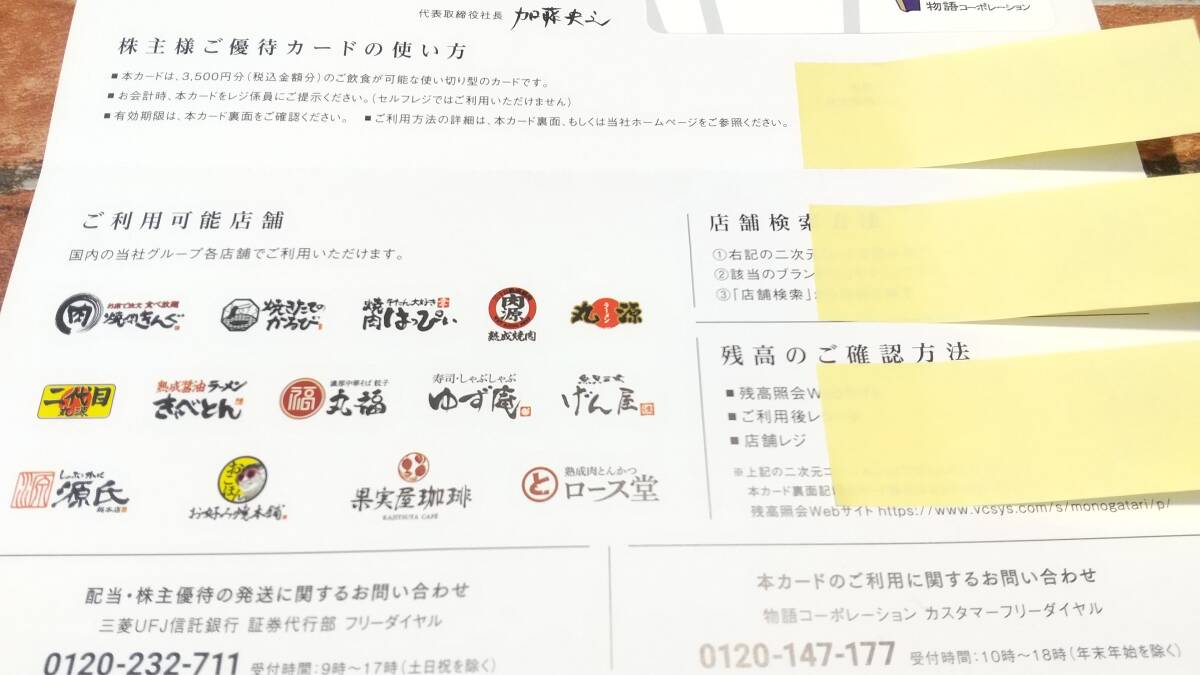 ★最新★ 物語コーポレーション 株主様ご優待カード 3500円分 2026/9/30期限 焼肉きんぐ 丸源 他 株主優待券 お食事券