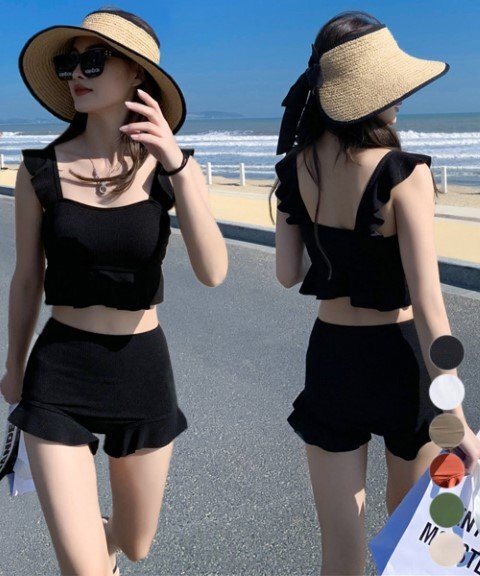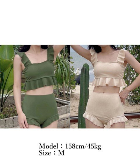 ビスチェ風ビキニ×ハイウエストショーツを組み合わせたフェミニンな雰囲気の水着セットです。