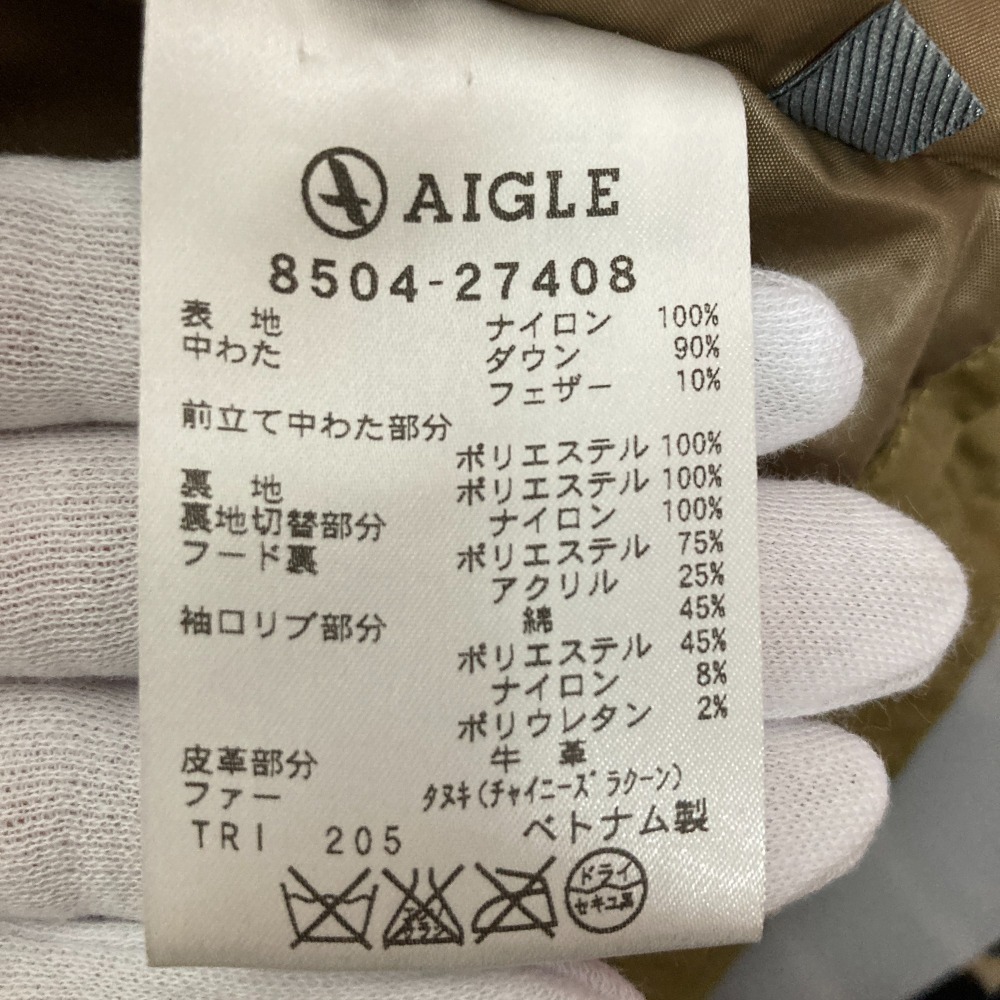 良品 AIGLE エーグル ナイロン ラクーンファー フーデッド ダウンコート ジャケット M カーキ