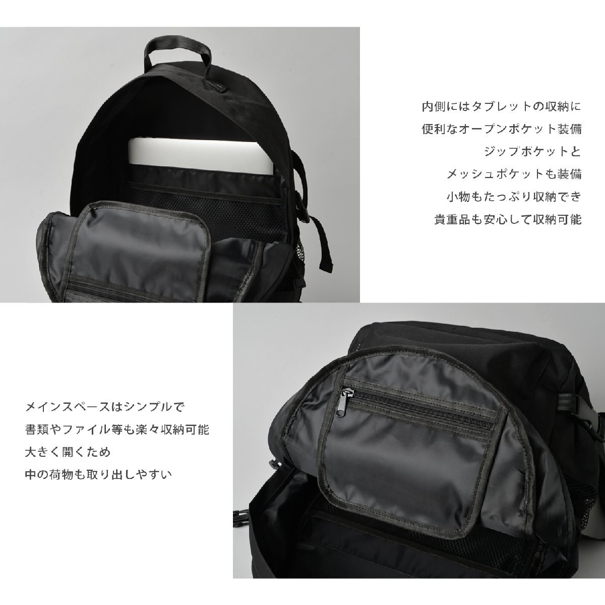 特徴 | デイリーユースから旅行にも最適で、荷物がたっぷり収納可能な使い勝手抜群のサイズ感。 A4ファイルはもちろん、タブレットやペットボトルなど、毎日使うものをたっぷり収納可能な大容量サイズ。日常使いはもちろん、アウトドアや、1~2泊の出張や旅行にもピッタリ。 丈夫な生地を使用しているので、毎日ハードに使える。 シンプルなデザインは飽きがこず、いろんな服装にマッチする万能リュックです。 |