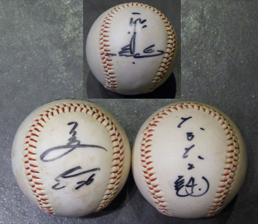 当時物 直筆サインボール 日本ハムファイターズ 江夏豊 他 3名分 2個まとめて。2名分は筆者不明です。分かる方御入札お願いいたします。 若干の経年の汚れ等あり。状態は画像参照でお願い致します。経年保存品の為、画像をよく見て頂き、状態に了承いただいた方のみの御入札をお願い致します。