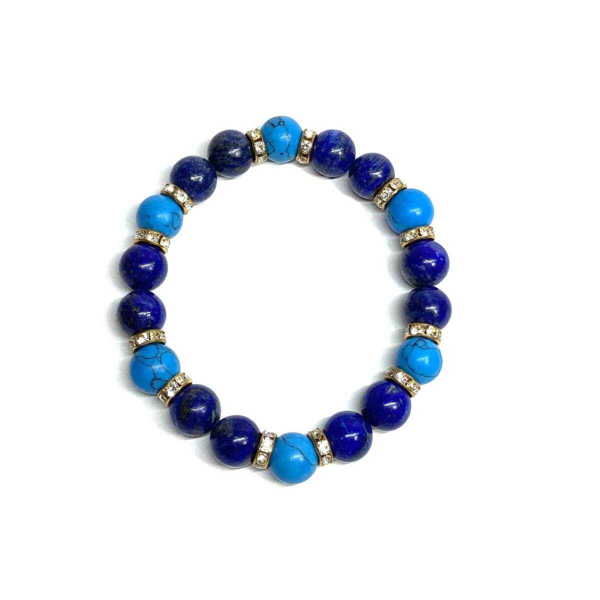 こちらは、ラピスラズリとターコイズを組み合わせたパワーストーンブレスレットです。間にはロンデルを挟み高級感あるデザインに仕上げております。石大きさは腕にも馴染みやすいように10mm玉で内径約18cm(伸可能)です。(サイズ変更の場合は取引ナビにてご連絡をお願いします。) 数に限りがございますので気になる方はお早めにどうぞ。