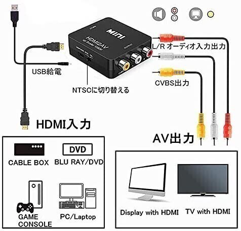 コアナログビデオ(黄コンポジット)映像出力しか搭載されていない古いAV機器と、HDMI端子を搭載している最新の映像機器をつなぐための変換コンバーターです。高画質でシャープな映像をテレビで観ることが実現されます。Mini USBケーブル付き、テレビやDVDなど普通のUSB口より電源供給できます。ミニサイズのAV2HDMIコンバーターは、アナログコンポジット(RCA3/CVBS) からHDMI に変換します。逆方向には使えません