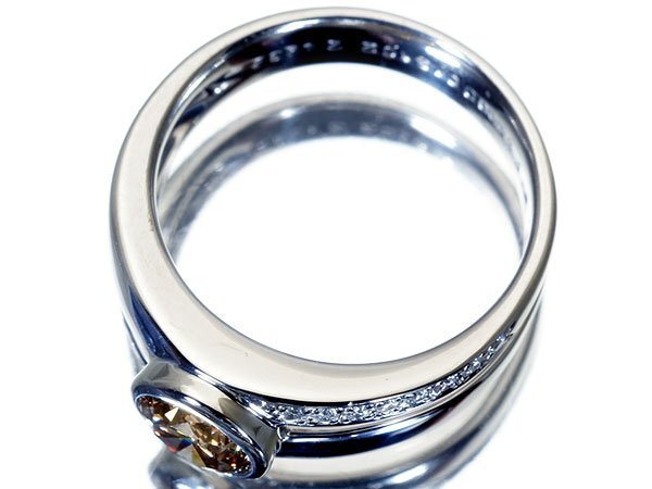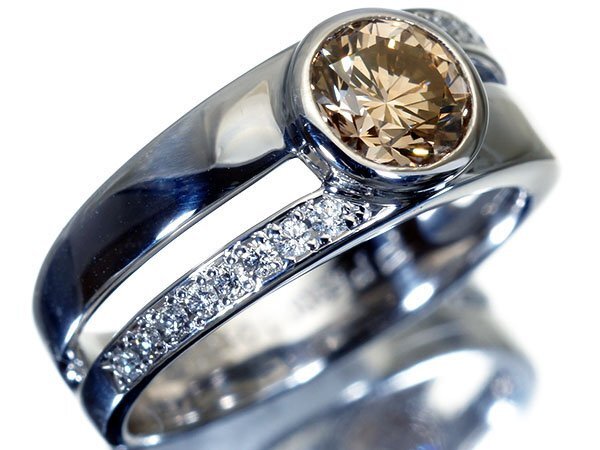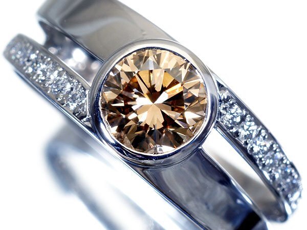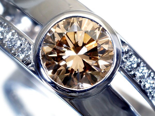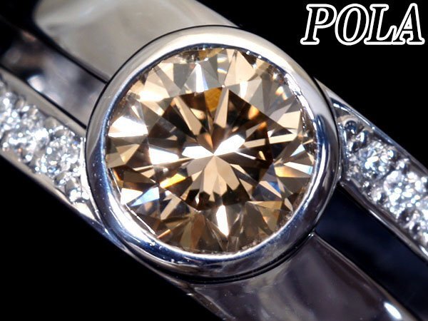 高級ジュエリーブランド【POLA】から、美しい輝き放つ超希少な超大粒極上天然1粒ブラウンダイヤモンド1.02ct&脇石クリアダイヤモンド総計0.13ctを素敵に宝飾した、超高級Pt900リングを1円から特別大放出致します!