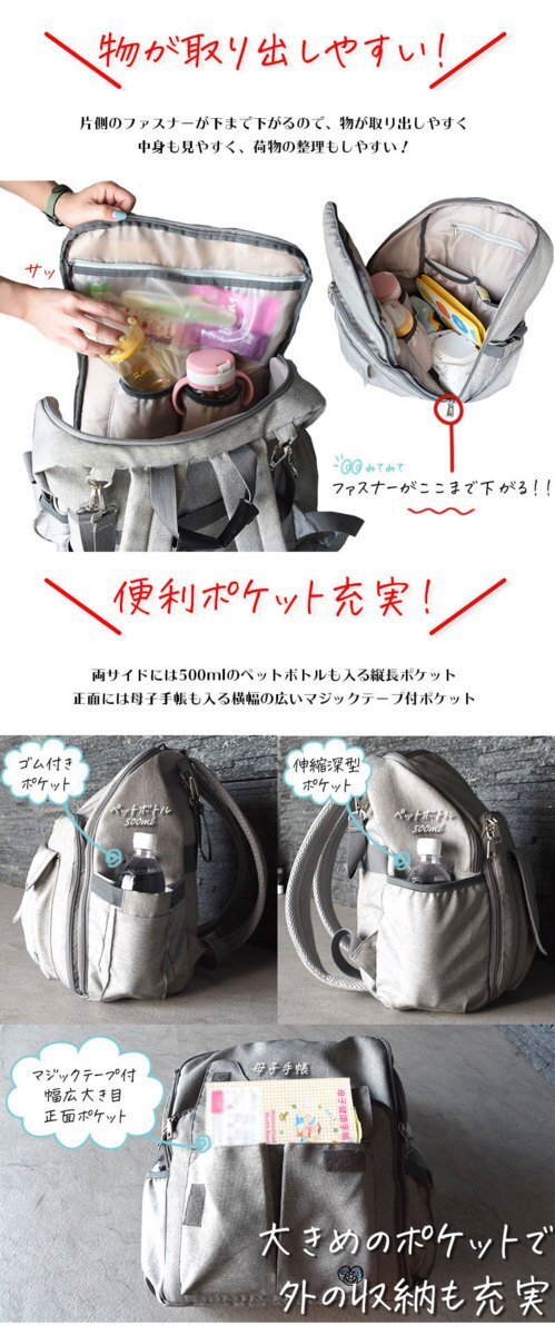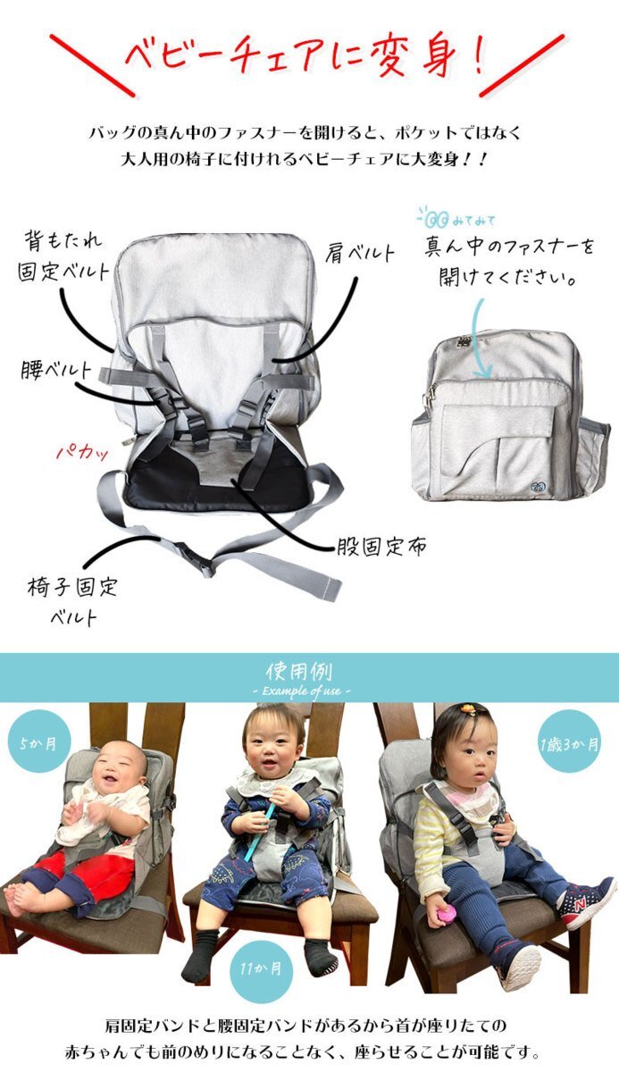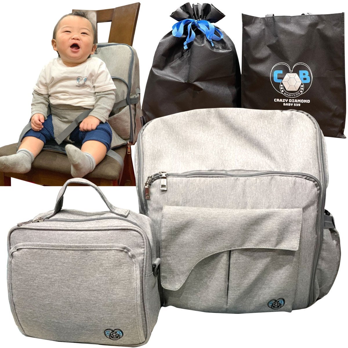■普通の椅子をベビーチェアにできるマザーズバッグとキッズリュックになるおむつポーチの大容量、多機能10点セットです。
