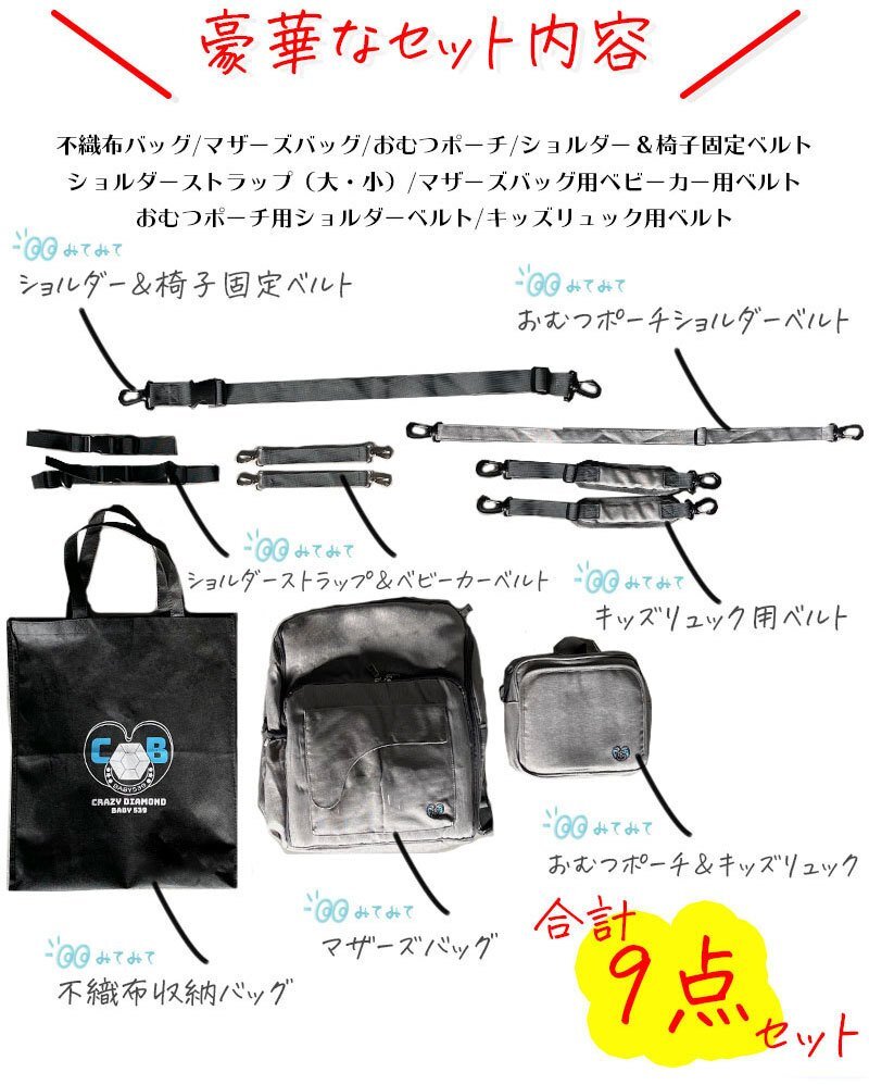 セット内容 マザーズバッグ/おむつポーチ/椅子固定用・ショルダー用ベルト/リュック用ベルト/ショルダー用ベルト/大人用ショルダーストラップ/子供用ショルダーストラップ/収納バッグ/プレゼント包装