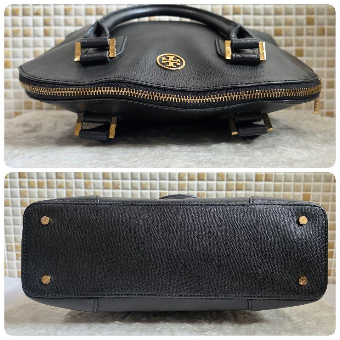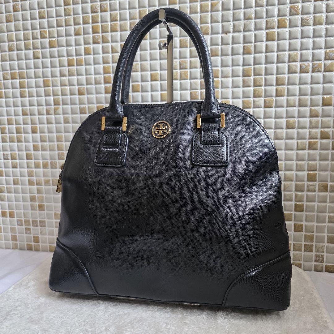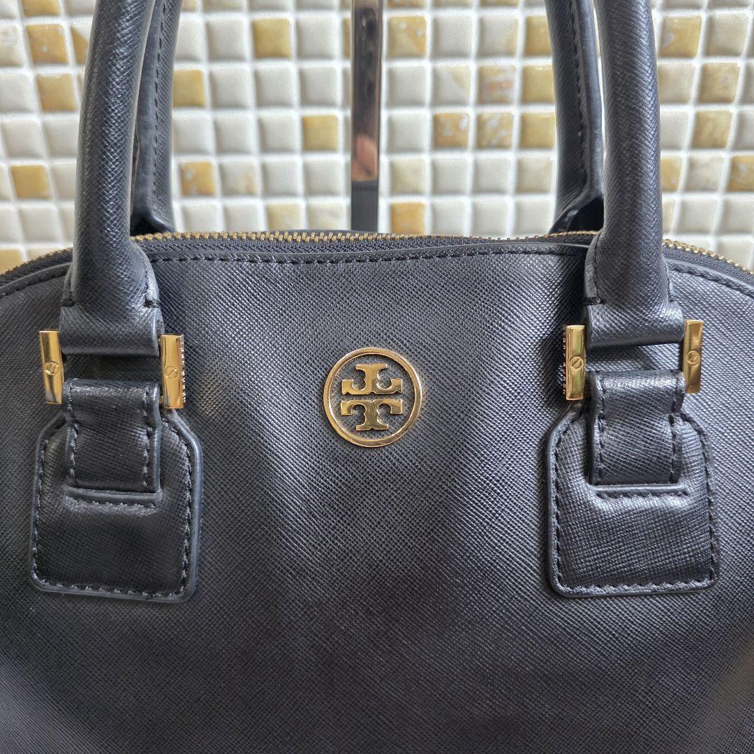 Tory Burchのロゴ金具がアクセントになったブラックのハンドバッグです。シンプルで上品なデザインながら収納力もあり、オンオフ問わず活躍する実用的なアイテム。ファスナー開閉で使いやすく、内ポケットも充実しています。