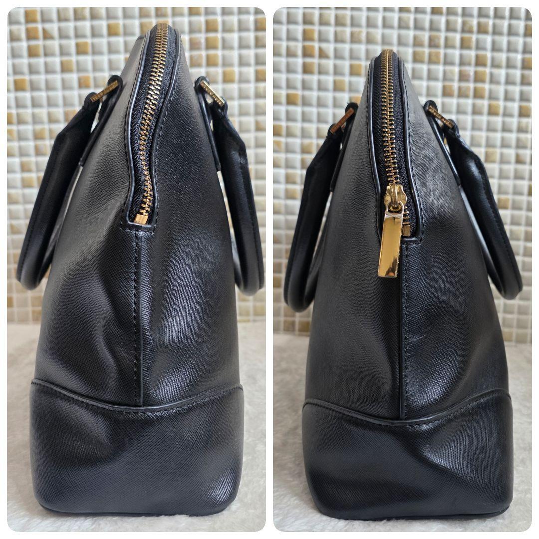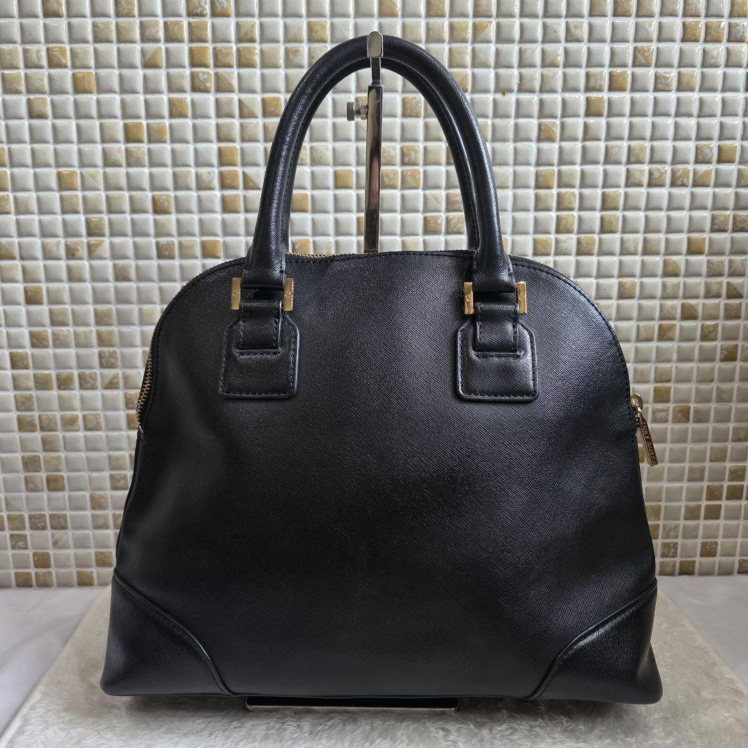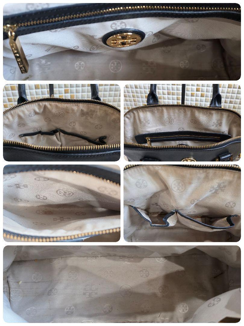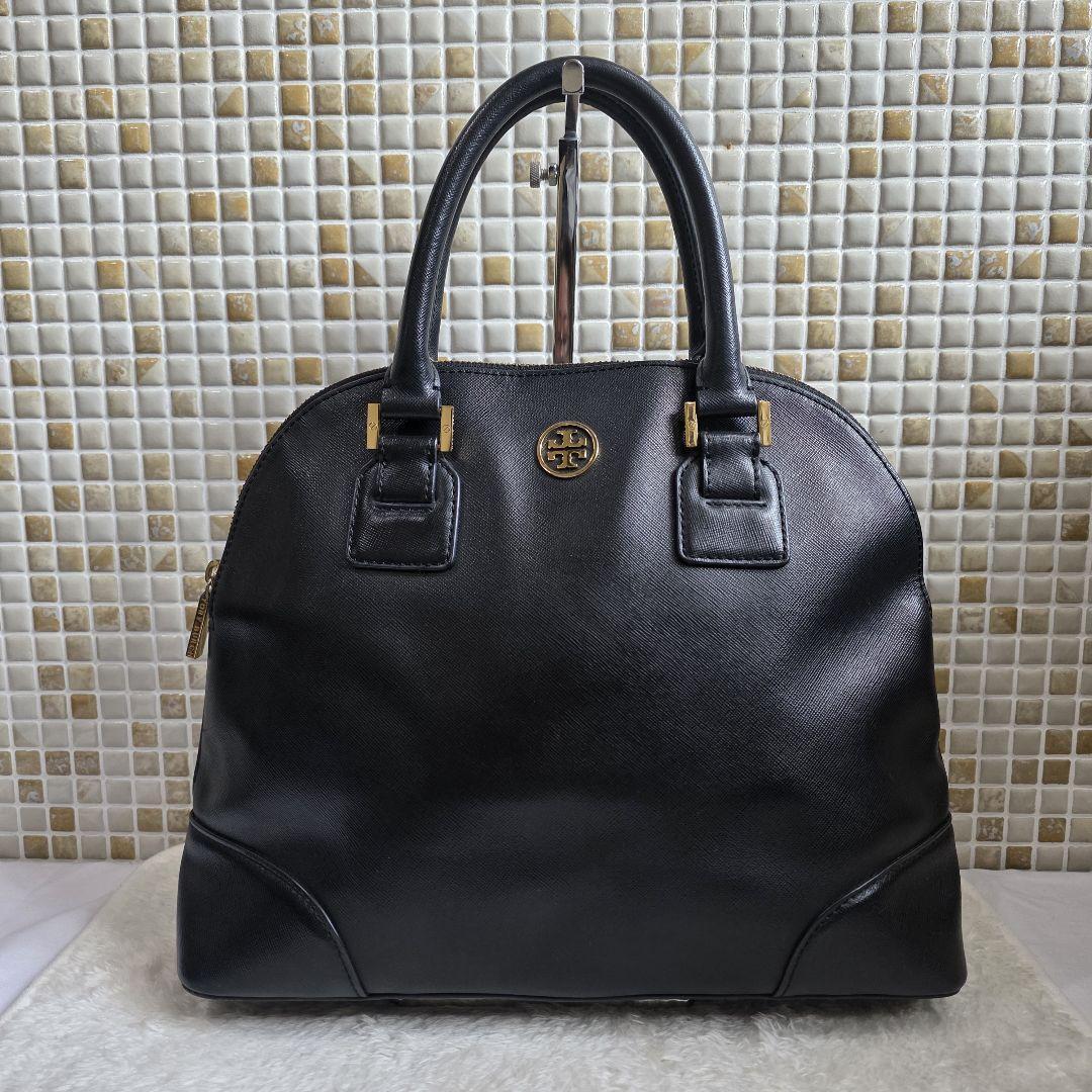 Tory Burchのロゴ金具がアクセントになったブラックのハンドバッグです。シンプルで上品なデザインながら収納力もあり、オンオフ問わず活躍する実用的なアイテム。ファスナー開閉で使いやすく、内ポケットも充実しています。