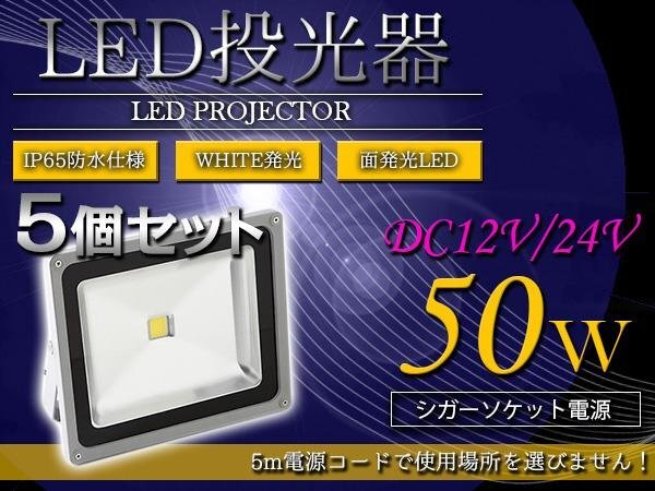 『※シガー電源 DC12V/24V』 超便利! 防水IP65 アルミ製 LED 投光器 50W 5個セット ホワイト 白発光 集魚灯 デッキライト 船
