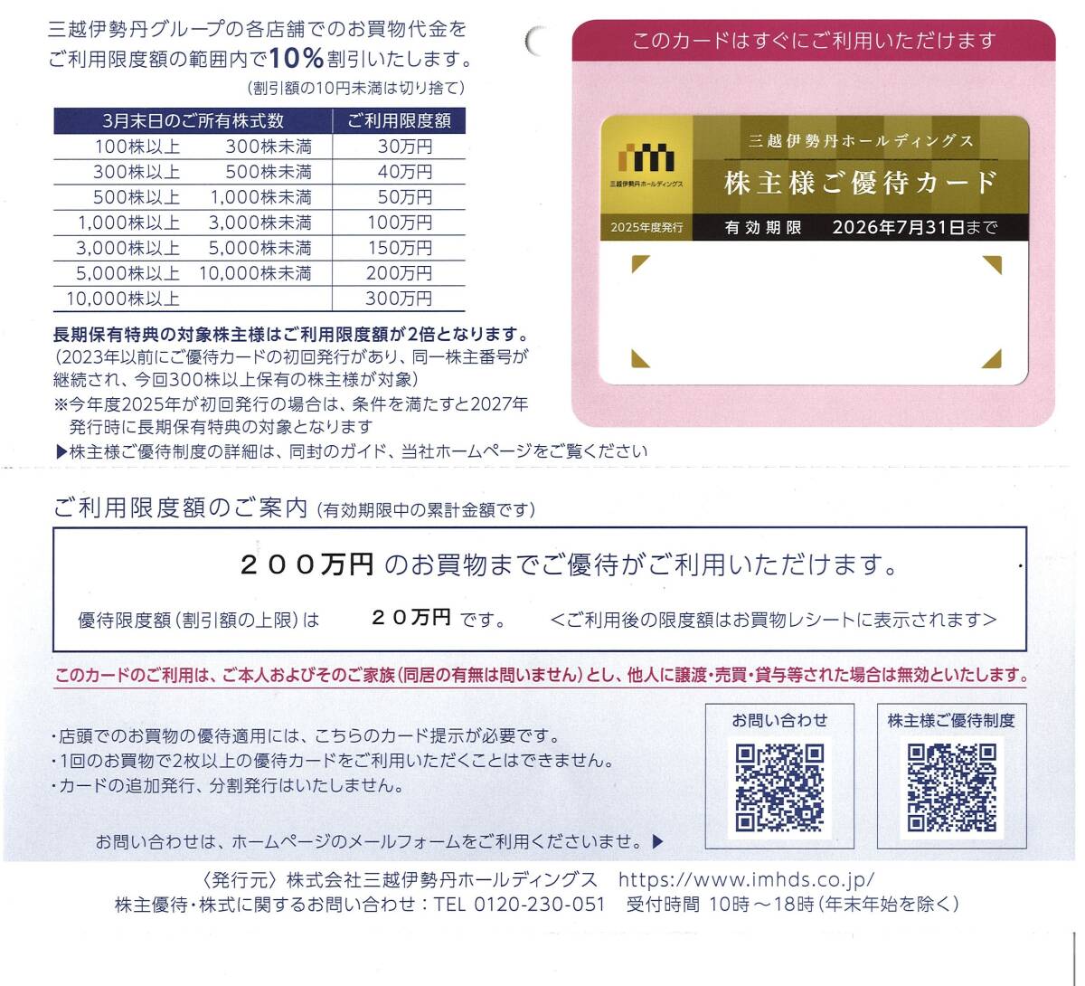 ■ 送料無料 ■ 三越伊勢丹 株主優待カード 限度額200万円 2026年7月31日迄 法人名義(男女可能) 宅急便コンパクト(補償有)