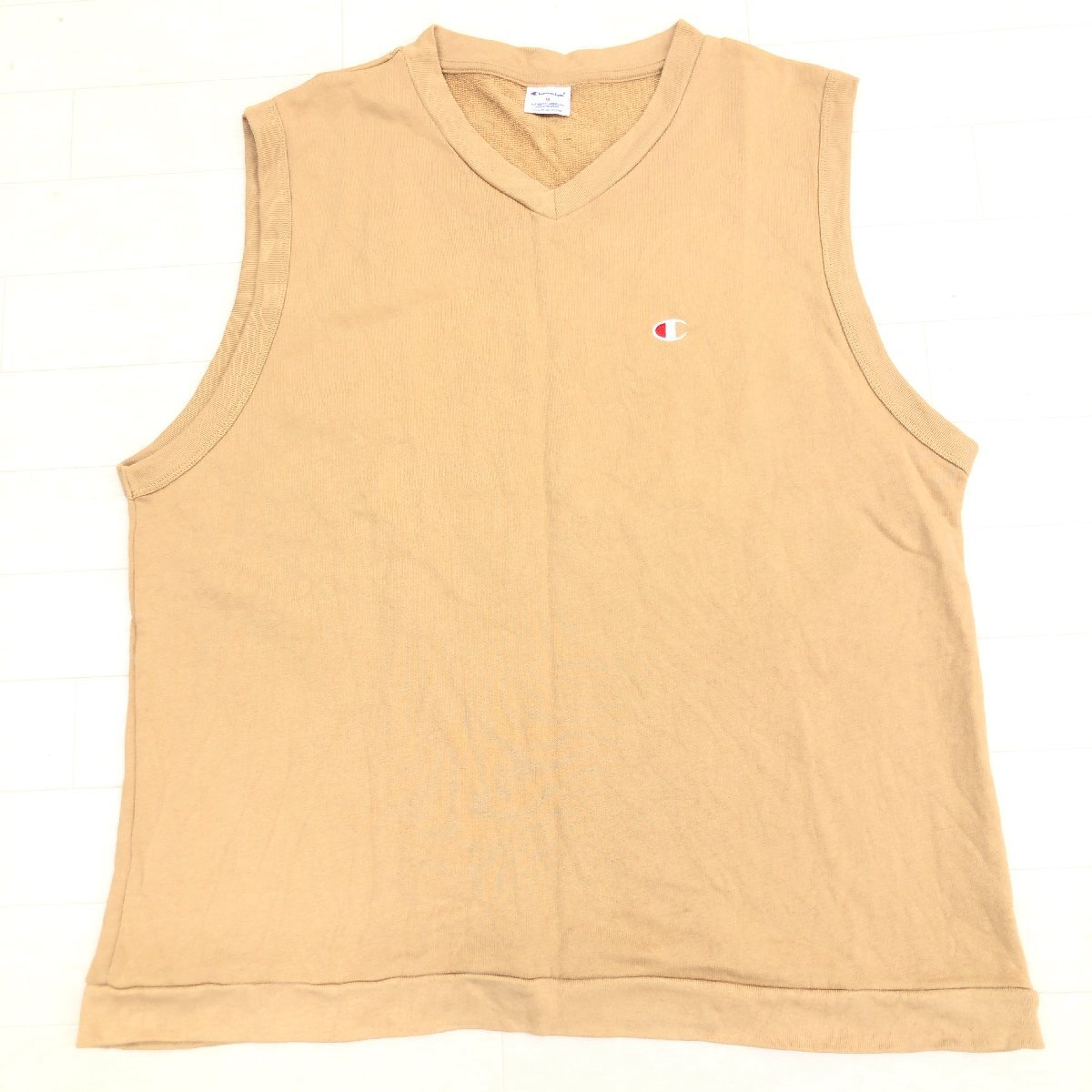 美品 Champion チャンピオン ロゴ刺繍 Vネック スウェット ノースリーブ シャツ M ベージュ ベスト Tシャツ アメカジ 古着 メンズ