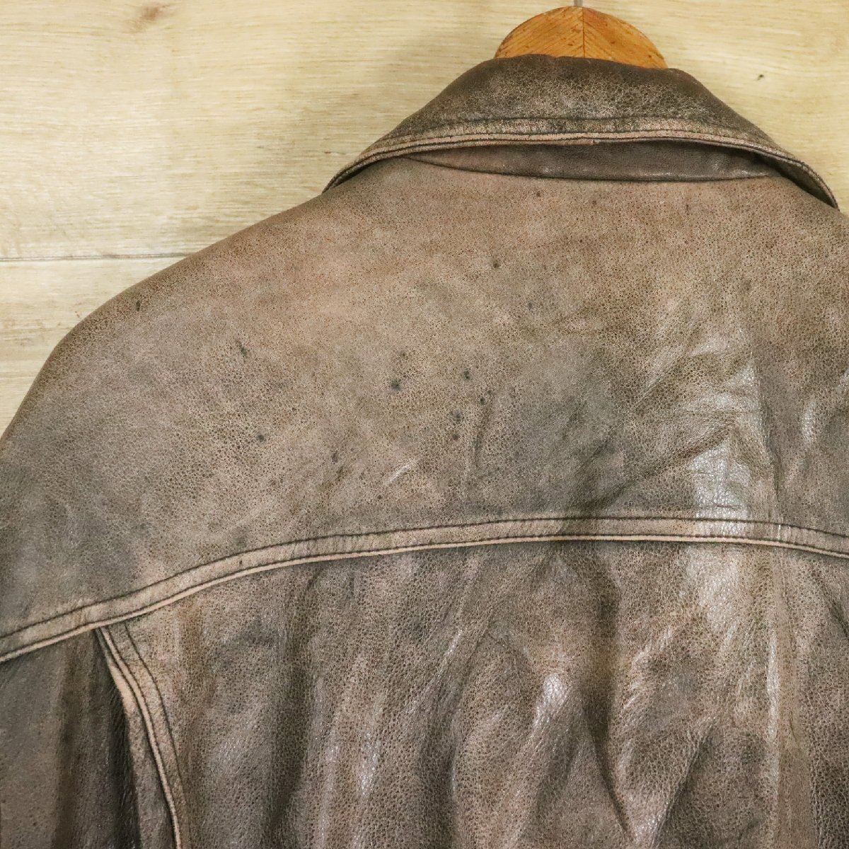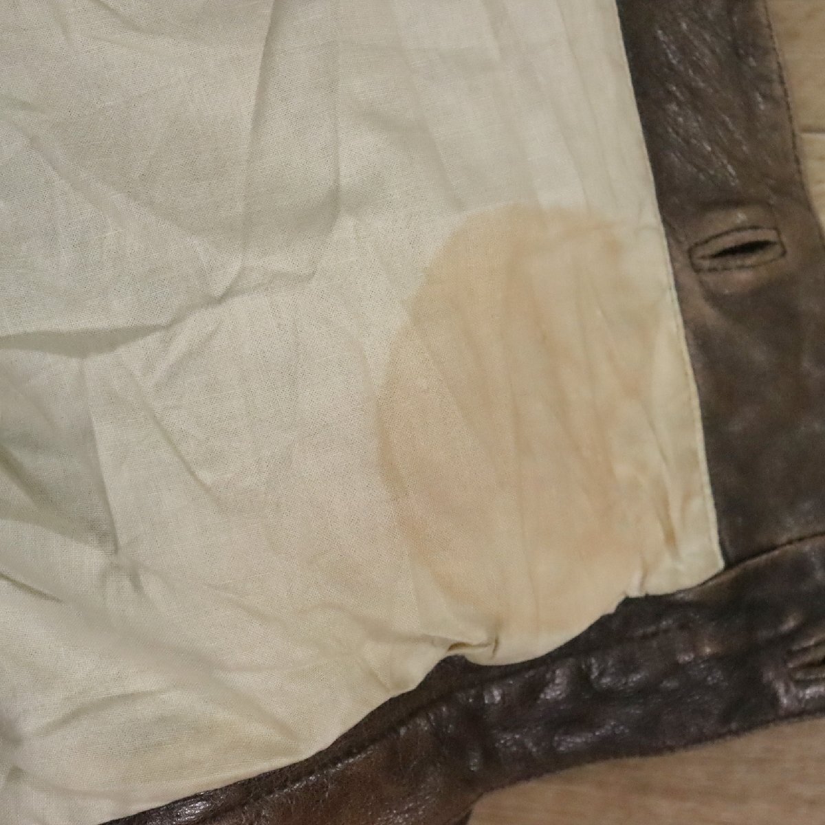 中古品です。使用感があります。経年によるレザー特有の擦れと色班、裏地と袖裏と襟に薄汚れがありますが、他に大きなダメージはありません。