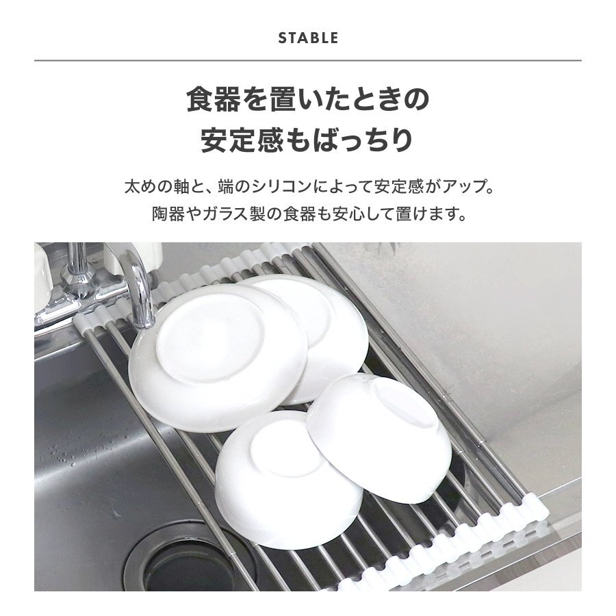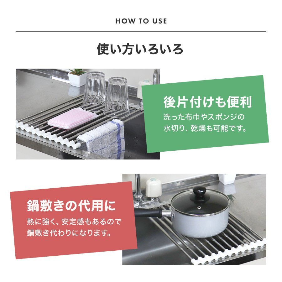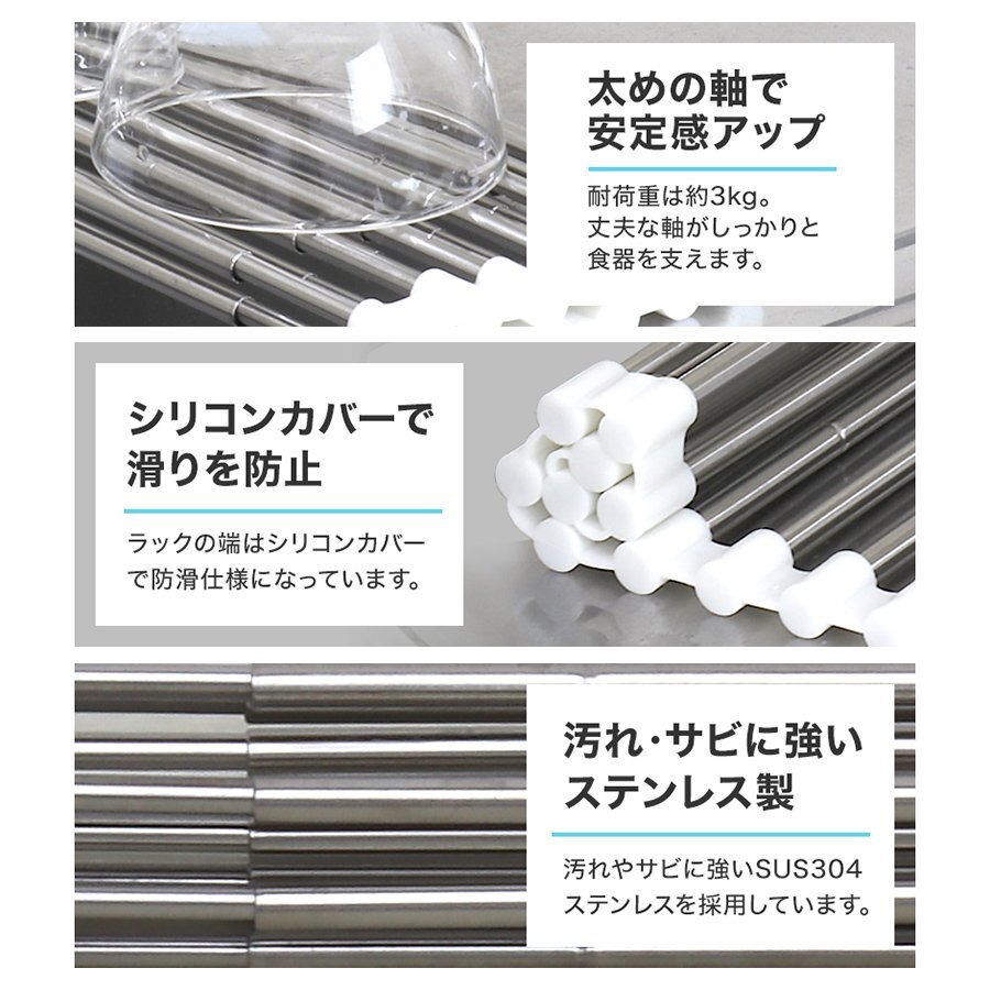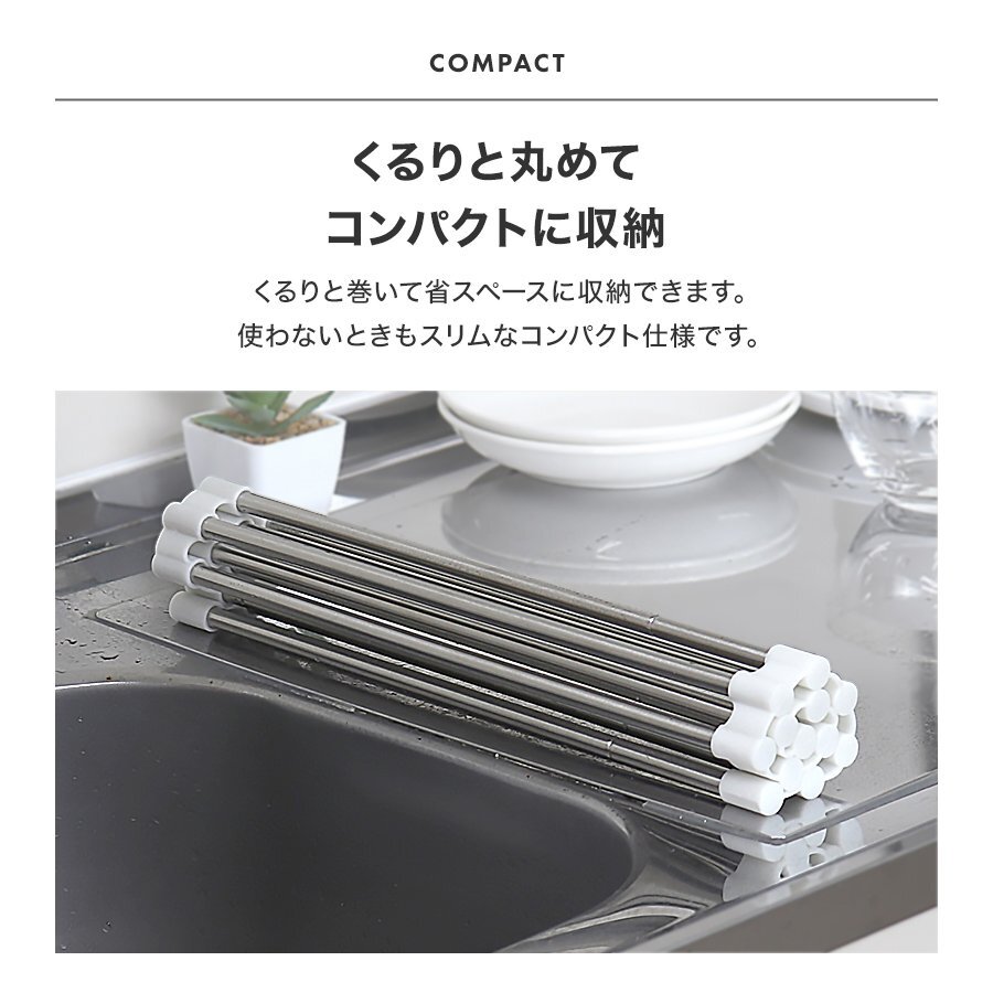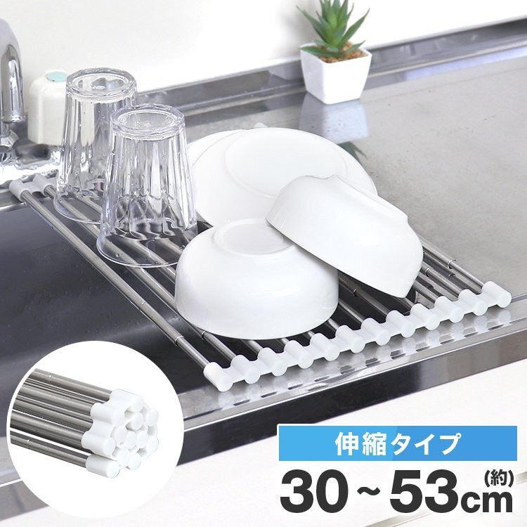 伸縮タイプの水切りラックです! 各ご家庭のシンクサイズに対応できます。 両端には水回りでも滑りにくいシリコン素材を採用! パイプ部分は、サビにくいステンレス製。 また、耐熱性に優れているので、調理中の鍋の一時置きや鍋敷きとしても使えます!! シリコン部分はハサミでカット可能なので、 シンク幅や使いたいサイズに合わせてカットして使用可能です。 くるくると丸めてコンパクトに! 少しの隙間があれば、手軽に簡単に収納できちゃいます♪ 汚れが気になったら、丸ごと水洗いOK! いつでもキレイな状態で使い続けられます☆ 【商品詳細】 サイズ:(約)横23cm×縦32~53cm(伸縮式) 耐荷重:(約)3kg 【注意事項】 ・当商品はゆうパケットにて配送になり、ポスト投函となります。 ・日付&時間指定不可(ご自宅のポストにお届け)。 ・商品は、モニターによって色合いが異なって見える場合があります。 ・仕様/デザインは改良のため予告なく変更することがあります。 |
